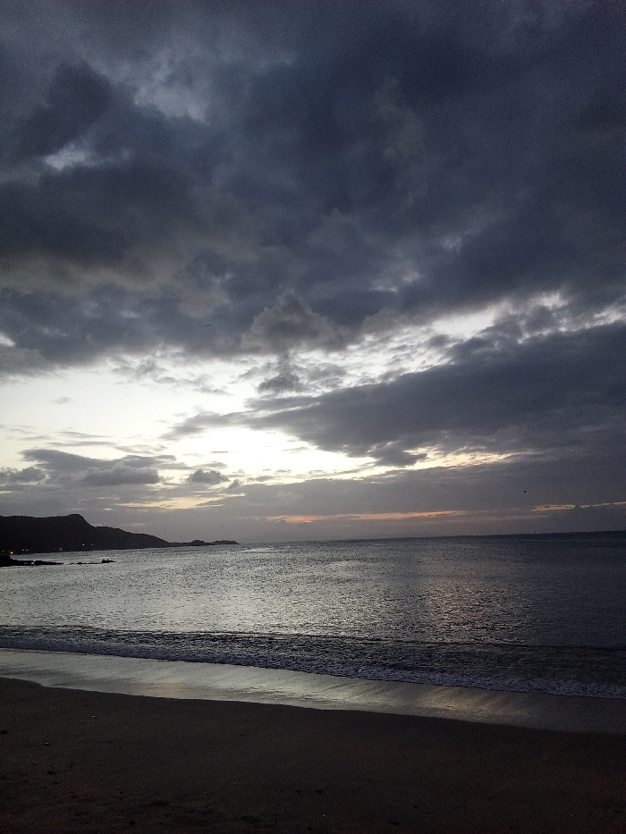 A seascape at dusk under a dramatic, cloudy sky. Dark, brooding clouds dominate the upper frame, partially illuminated by a fading light. The ocean reflects the sky's somber tone, with gentle waves ap…read more