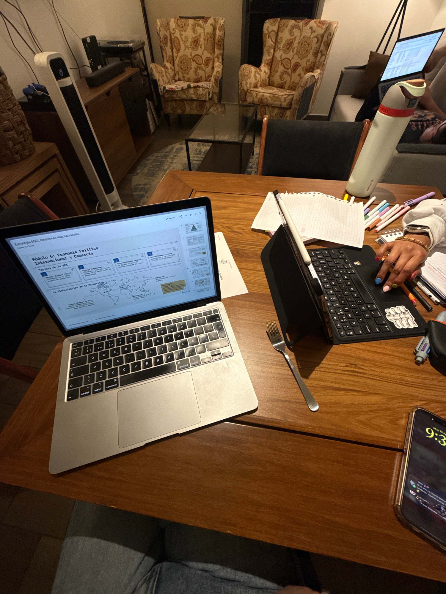 The image captures a scene of study or work in progress, with a wooden table dominating the view. On the table are multiple devices including a MacBook and an iPad, along with a keyboard, a fork, a no…read more