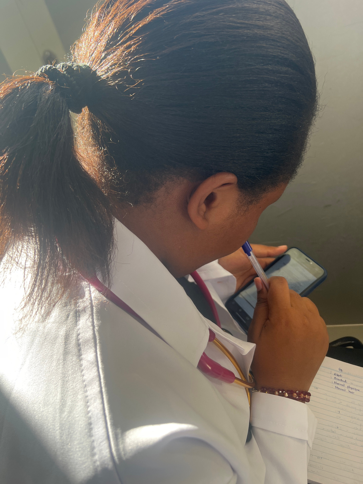 A person with dark hair pulled into a ponytail is viewing a mobile phone while holding a pen. The person is wearing a white lab coat and a beaded bracelet. A stethoscope is draped around their neck. A…read more