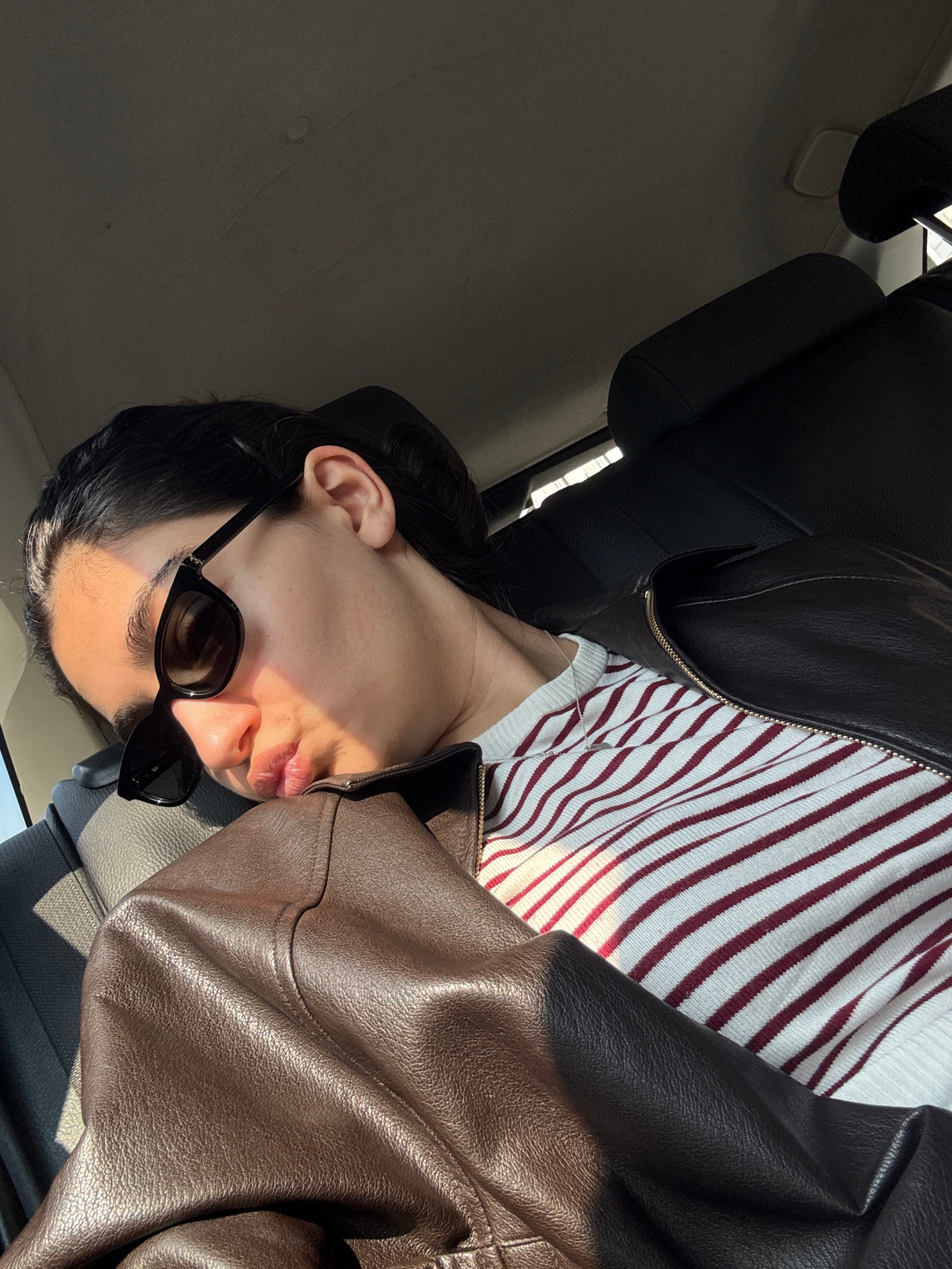 The image displays a close-up, rotated view of a person's side profile, seated inside a car. The individual is wearing a white sweater with horizontal red stripes and a textured dark brown or bronze-c…read more