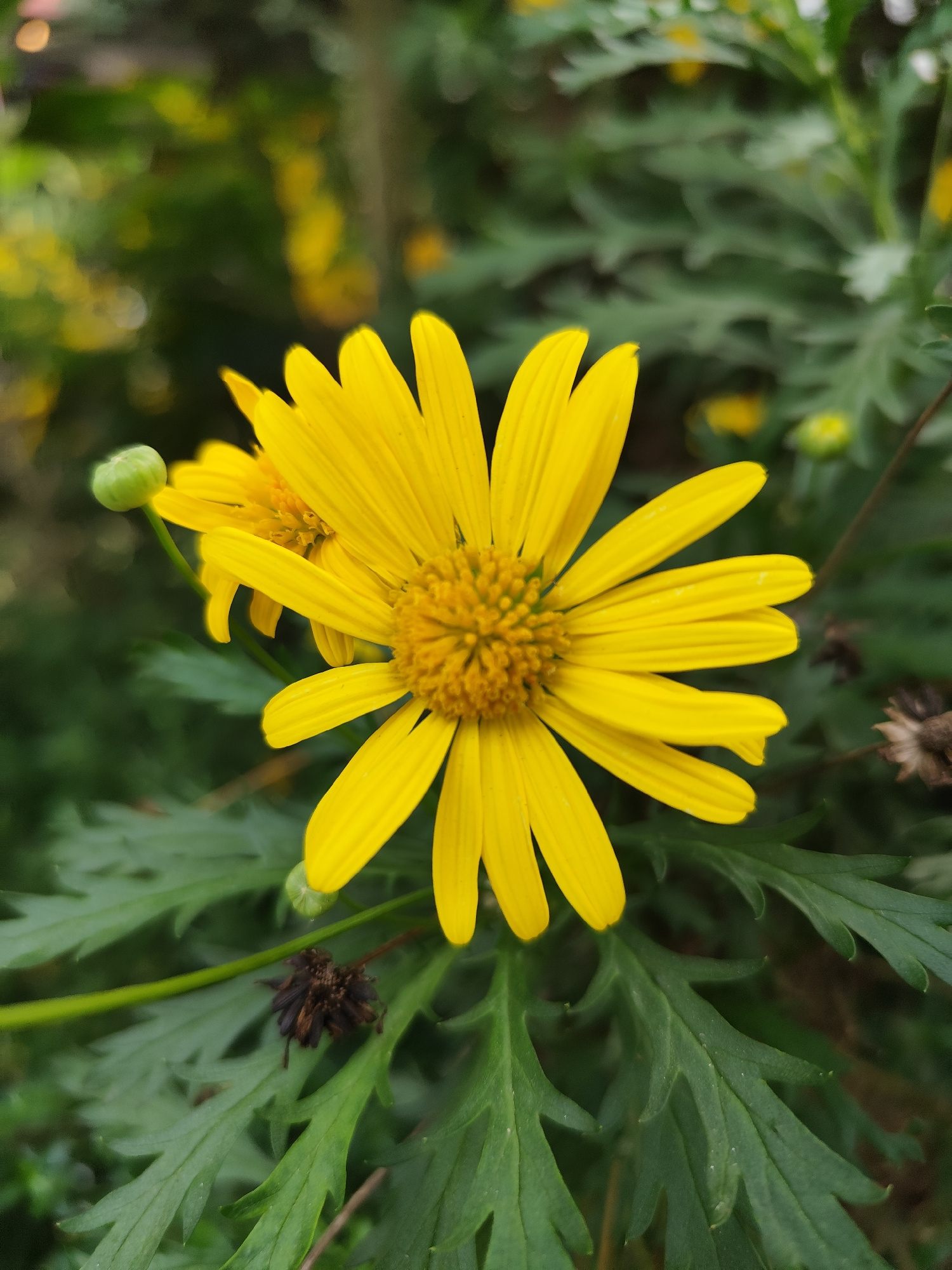 The image captures a close-up view of a yellow daisy-like flower with numerous petals arranged around a central disc. The flower is in full bloom, exhibiting a bright and vibrant yellow color. The sur…read more