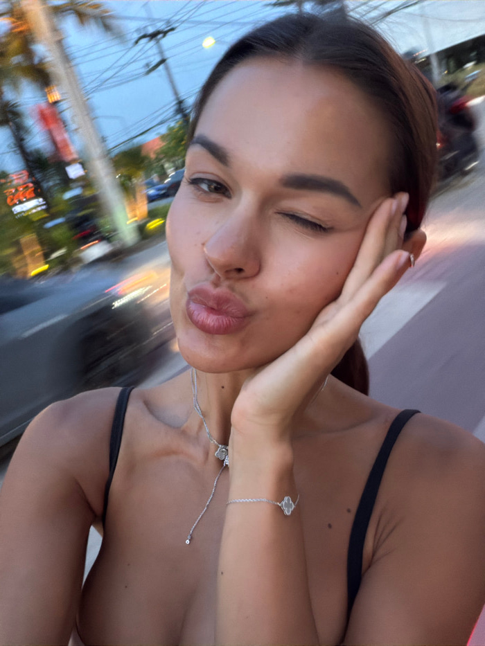 A selfie captures an adult female outdoors in Choeng Thale, Thailand, against a significantly blurred urban background, indicating movement or shallow depth of field. The subject, positioned centrally…read more