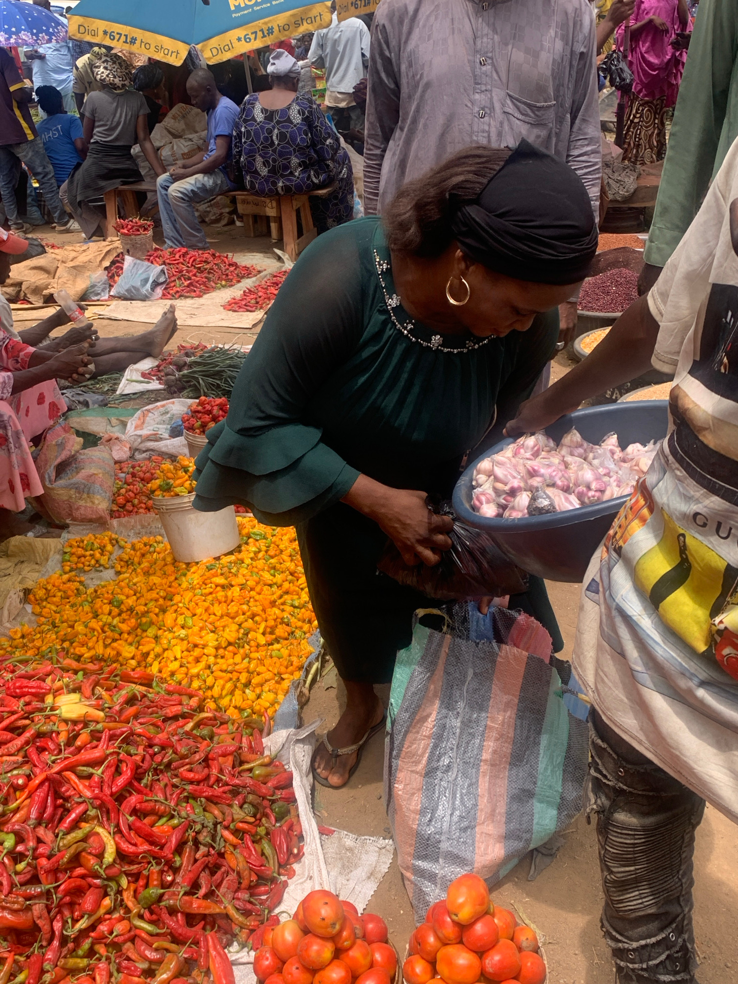 The image depicts a bustling marketplace scene likely in Jos, Nigeria. The main subject is a woman wearing a dark green dress and a black head covering. She is engaged in purchasing garlic from a vend…read more