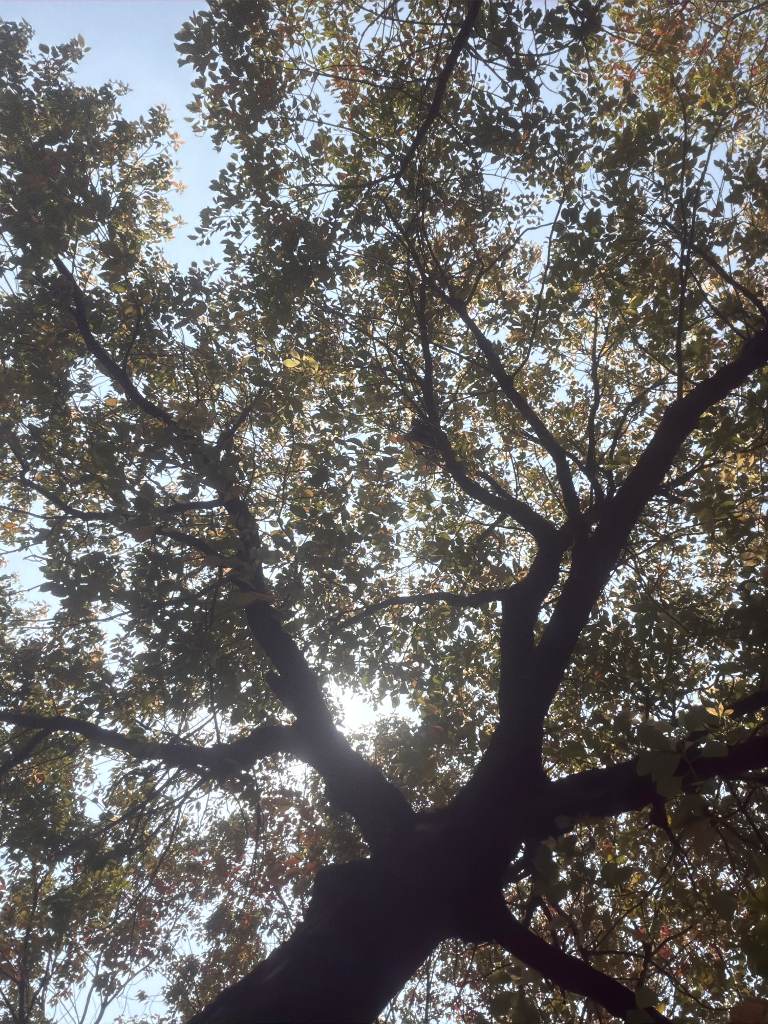 A low-angle shot of a tree with leaves and branches against a light blue sky. The tree is partially silhouetted. The sun is shining through the tree, creating a bright spot in the center. The location…read more