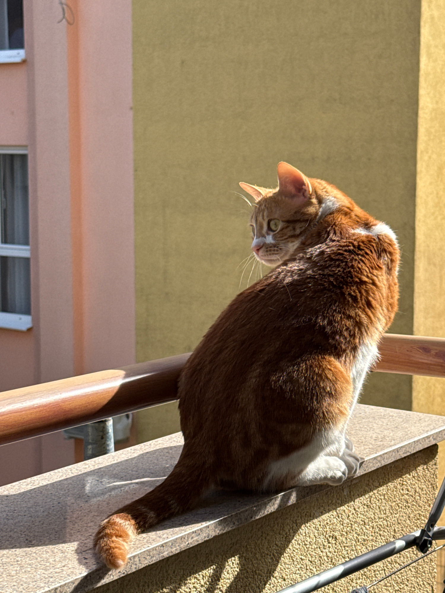 An orange and white cat is perched on the side of a staircase or balcony railing, looking down. The staircase is made of light-colored stone or concrete and has a wooden railing. The background shows…read more