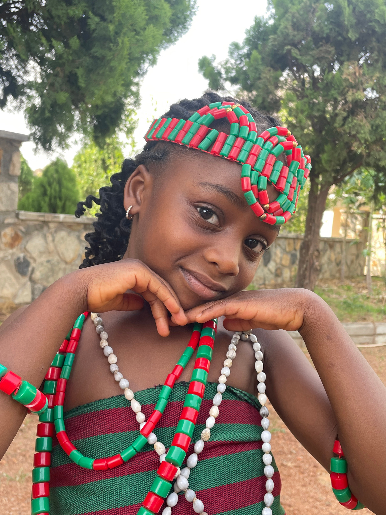 A young girl is the subject of the photo, adorned in traditional Igbo attire. She wears a red and green beaded headband and matching necklaces, interspersed with strings of white beads. Her dress is a…read more