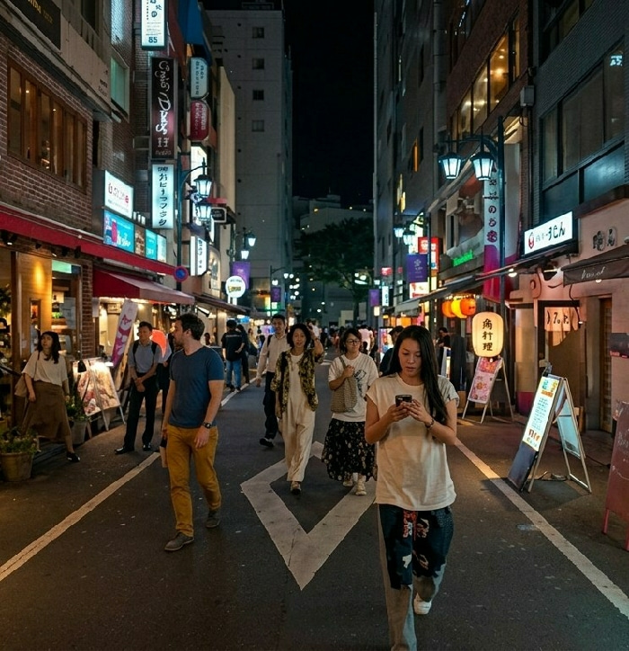 The image depicts a nighttime street scene in Shinjuku, Japan. The street is lined with multi-story buildings featuring numerous brightly illuminated commercial signs, primarily in Japanese script, al…read more