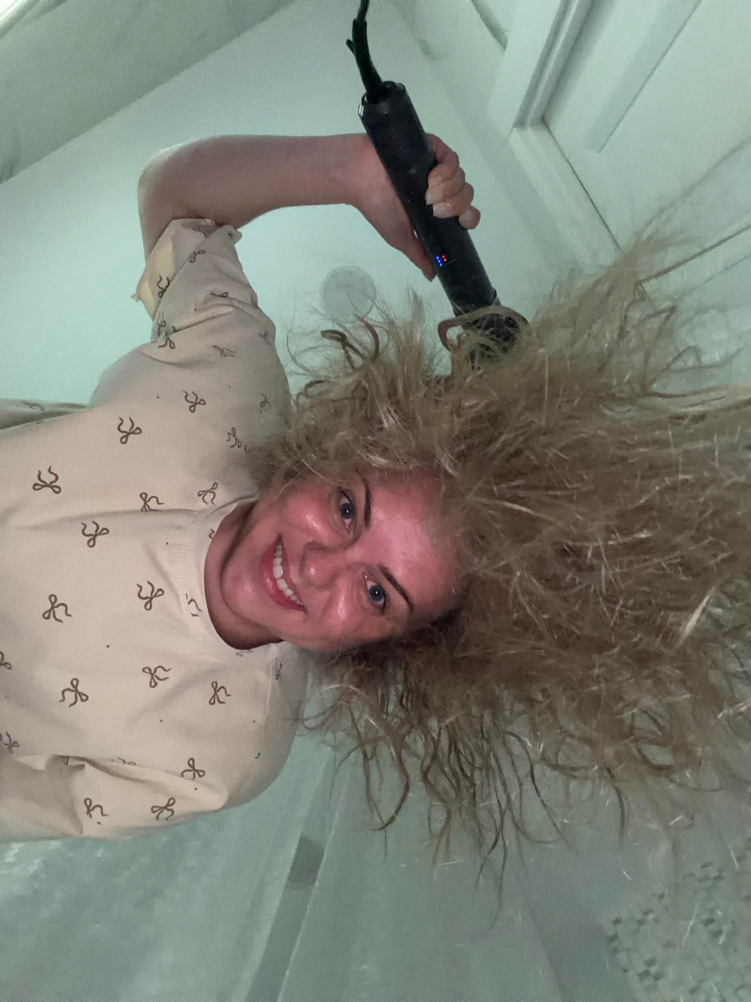 A woman with blonde, frizzy hair is smiling at the camera while holding a black hair styling tool above her head. The woman has fair skin and blue eyes, and is wearing a beige top with a bow pattern.…read more