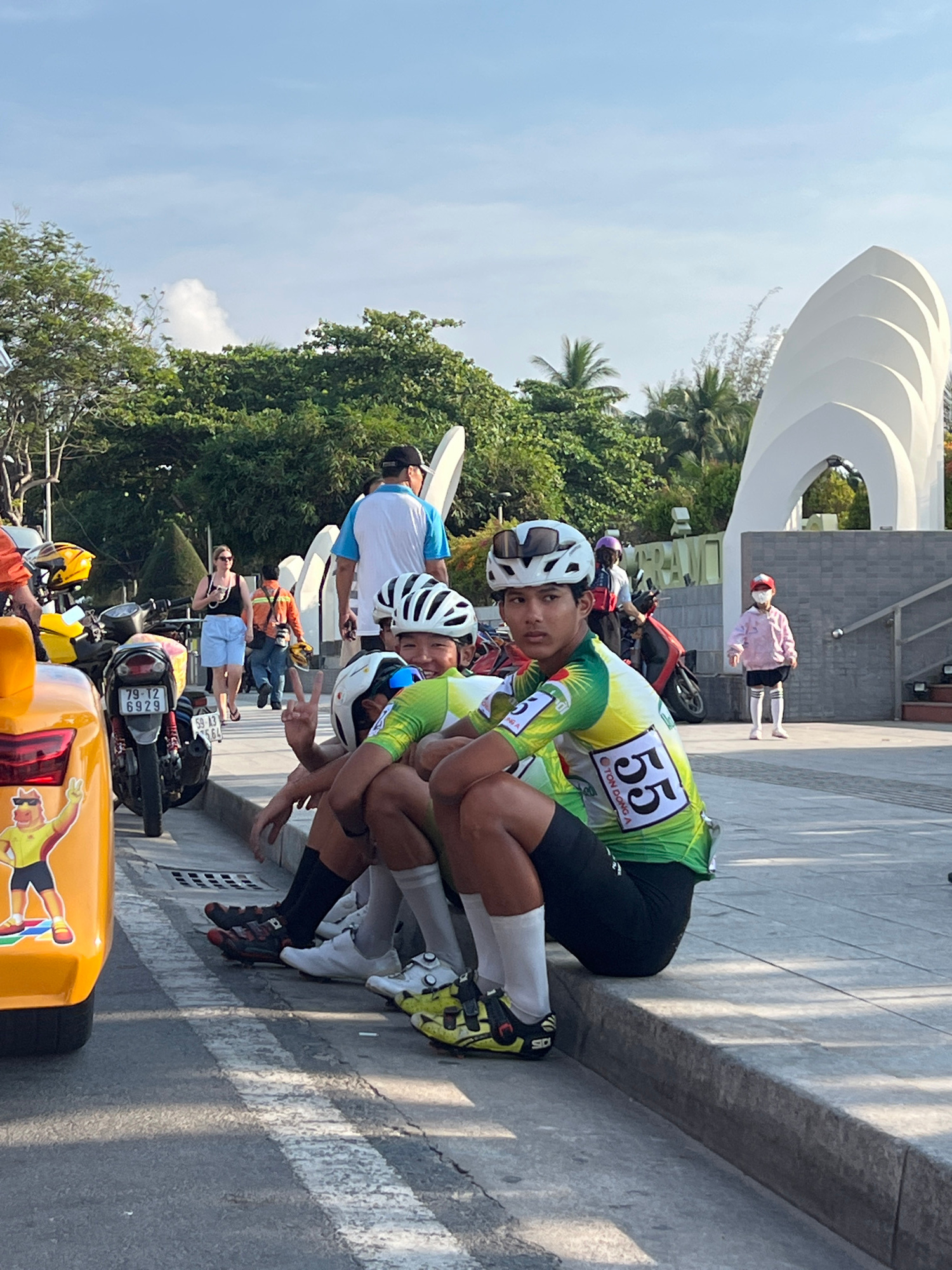 The image captures a group of cyclists resting alongside a sidewalk in Nha Trang, Vietnam. At least three cyclists are visible, wearing helmets, athletic jerseys, and cycling shoes. One cyclist is cle…read more