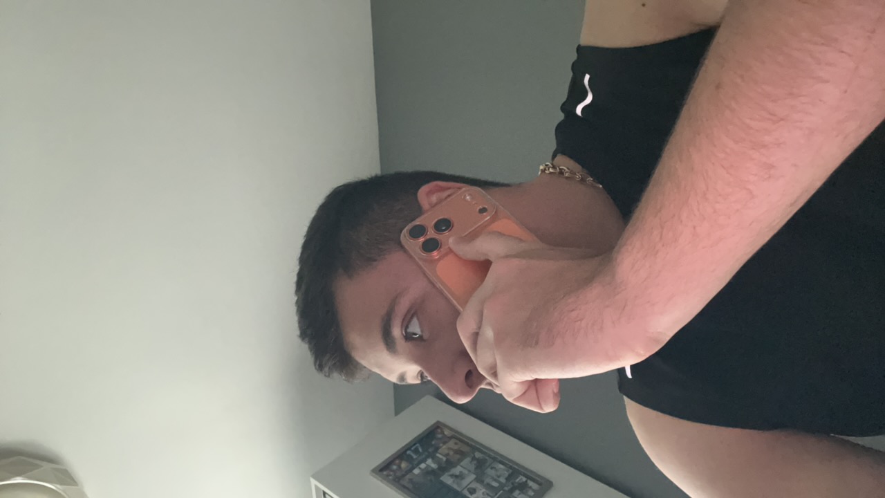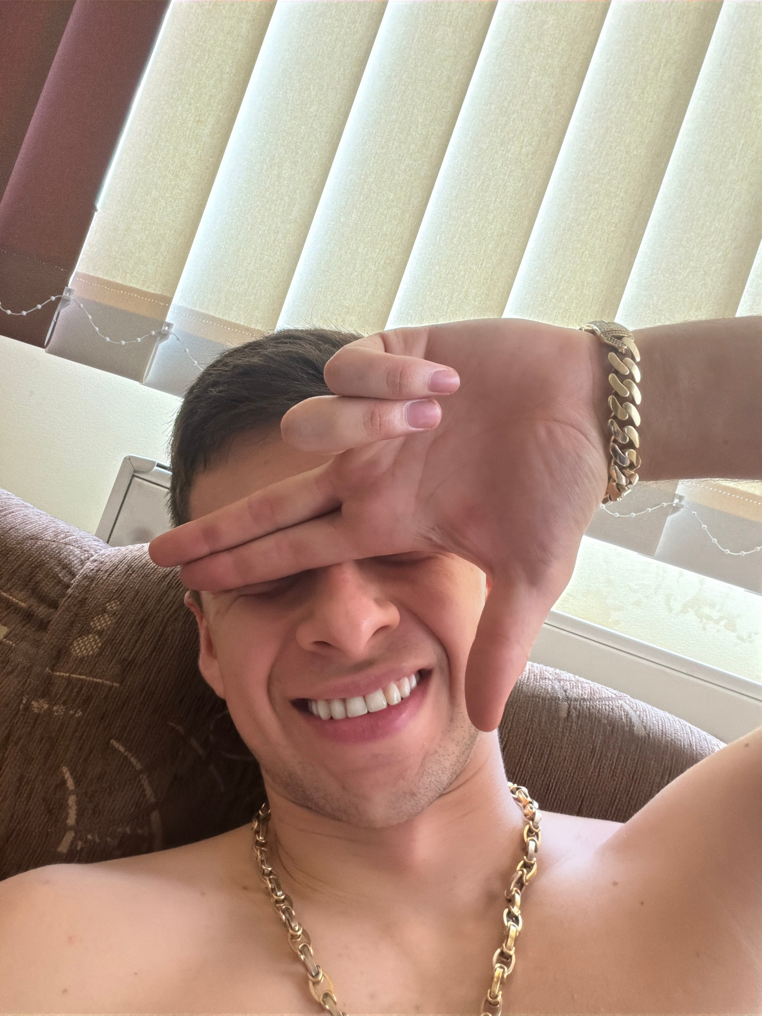 A man is positioned upside down in front of brown and beige blinds. He is wearing a gold chain necklace and a gold bracelet on his left wrist. His left hand is obscuring part of his face, and he is sm…read more