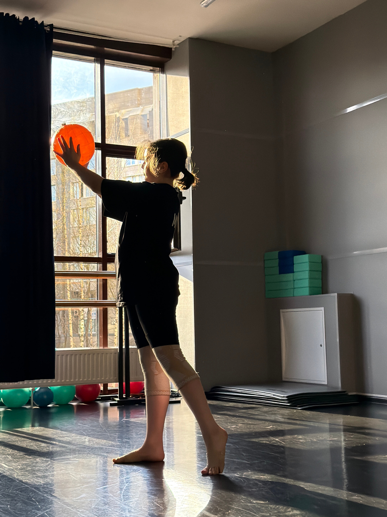 A person is depicted indoors, seemingly in a gymnasium or dance studio, performing a balance exercise near a window. The person is wearing dark clothing, with what appears to be support wraps around t…read more
