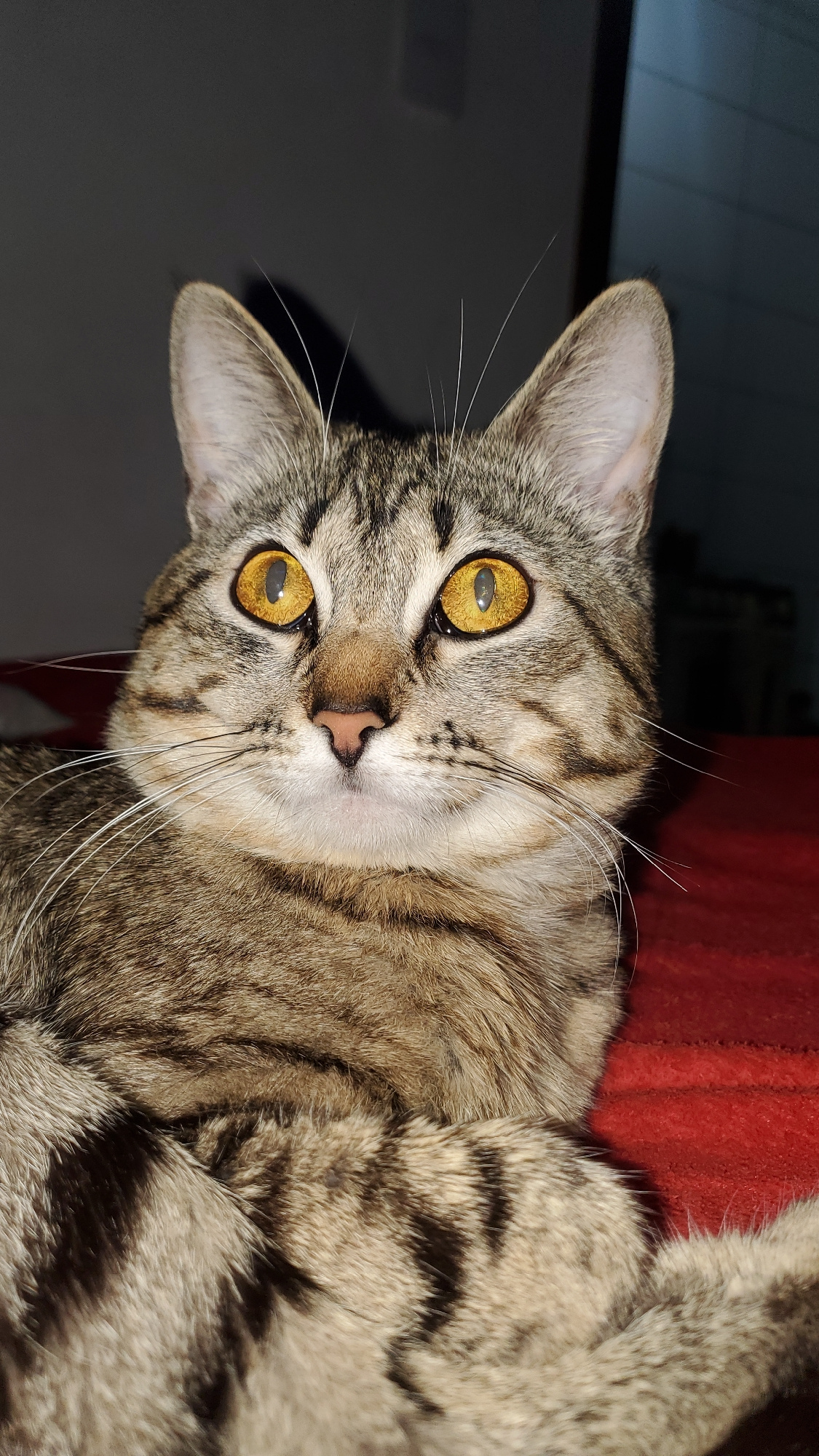 A close-up shot of a tabby cat lying down. The cat has brown and black striped fur and bright amber eyes. Its head is slightly tilted. The background appears to be a red blanket, and a dark, indistinc…read more