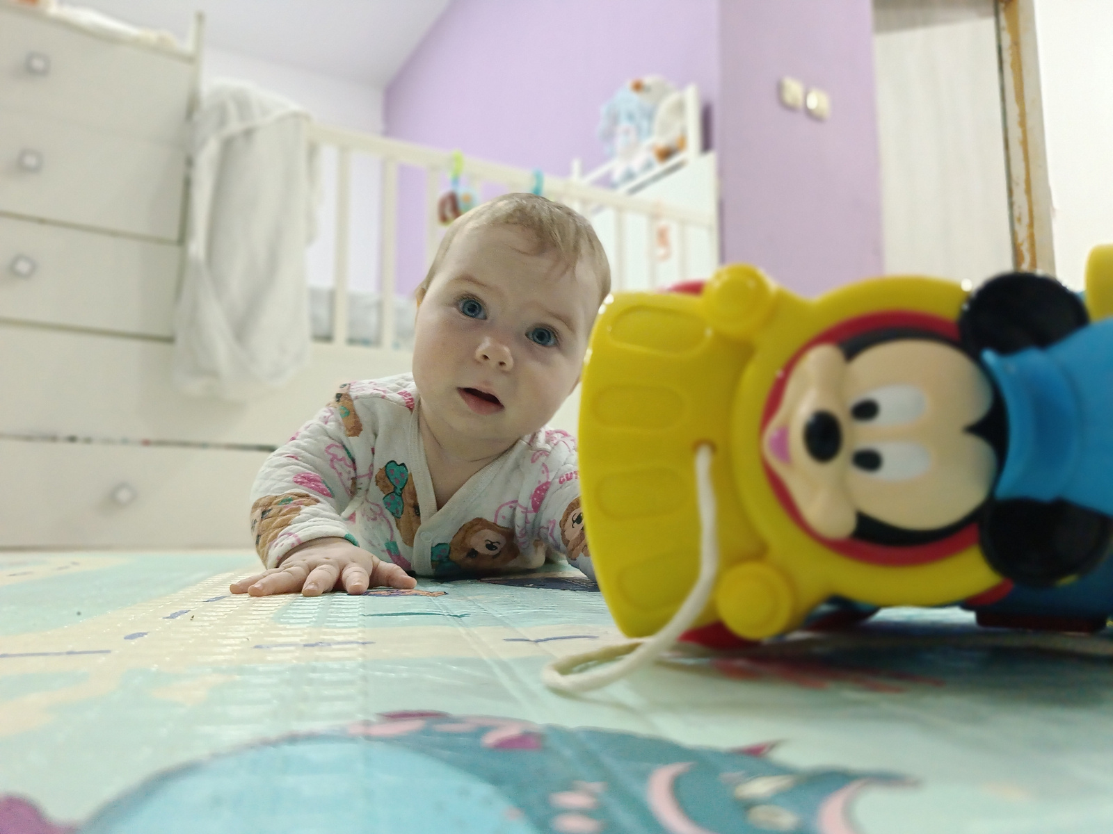 A baby lies on a colorful playmat, with a toy in the foreground. The baby has fair skin, blue eyes, and light brown hair. It wears a patterned, light-colored outfit. The toy is a yellow and red Mickey…read more
