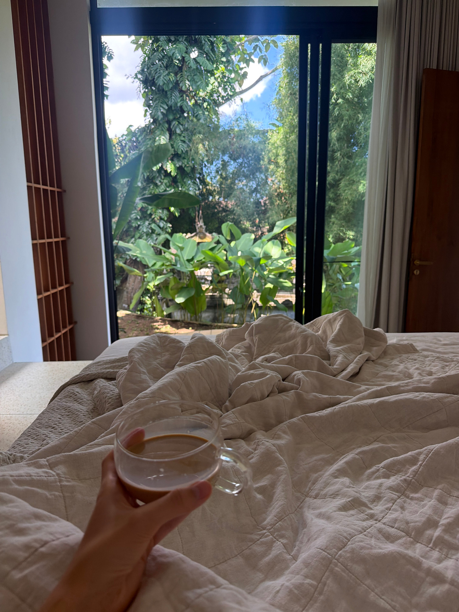 Here's a detailed description of the image: **Scene Overview:** The image captures an indoor scene, possibly a bedroom, with a view to the outside. A hand holds a glass cup with a light-colored liqui…read more
