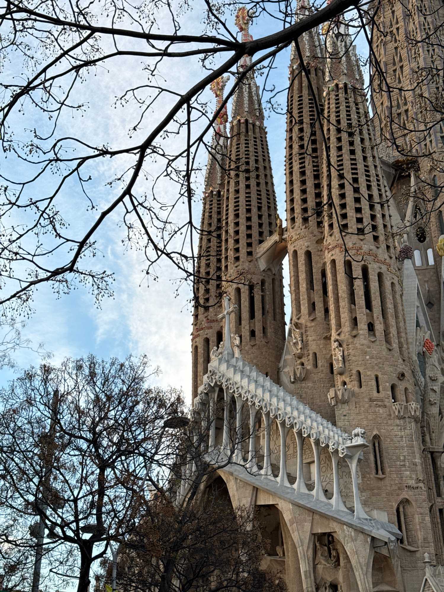 The image displays a detailed view of the Sagrada Familia basilica in Barcelona, Spain, from a low-angle perspective. Multiple stone towers of the basilica, characterized by intricate carvings and rep…read more