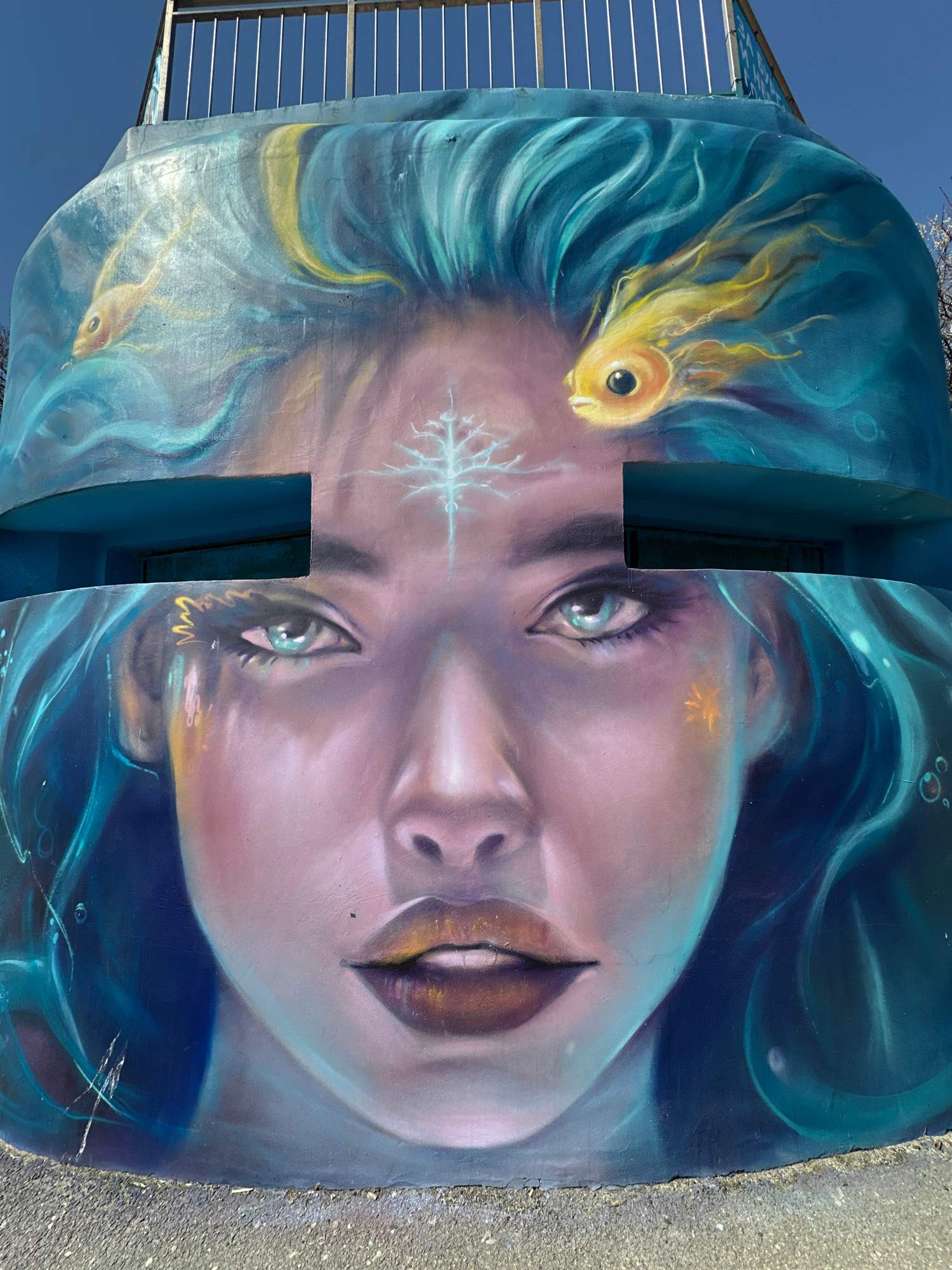 Here's a description of the image: The image is a close-up of a mural painted on a structure. The mural depicts the face of a woman with flowing, blue-green hair that blends with water-like swirls an…read more