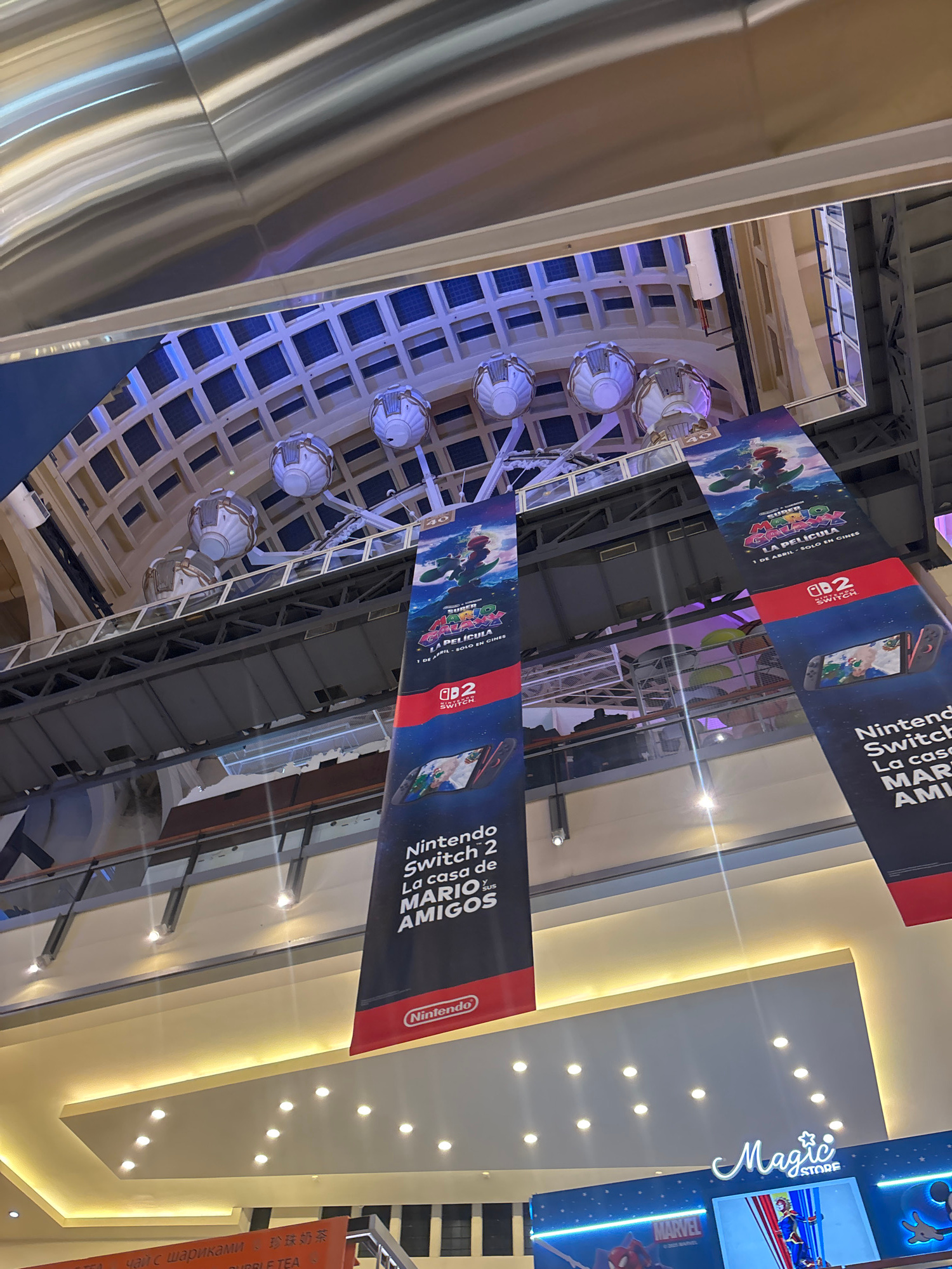 The image depicts an interior space, likely a shopping mall, in Buenos Aires, Argentina. Overhead, there are promotional banners for Nintendo Switch and the "Super Mario Galaxy" movie, both featuring…read more