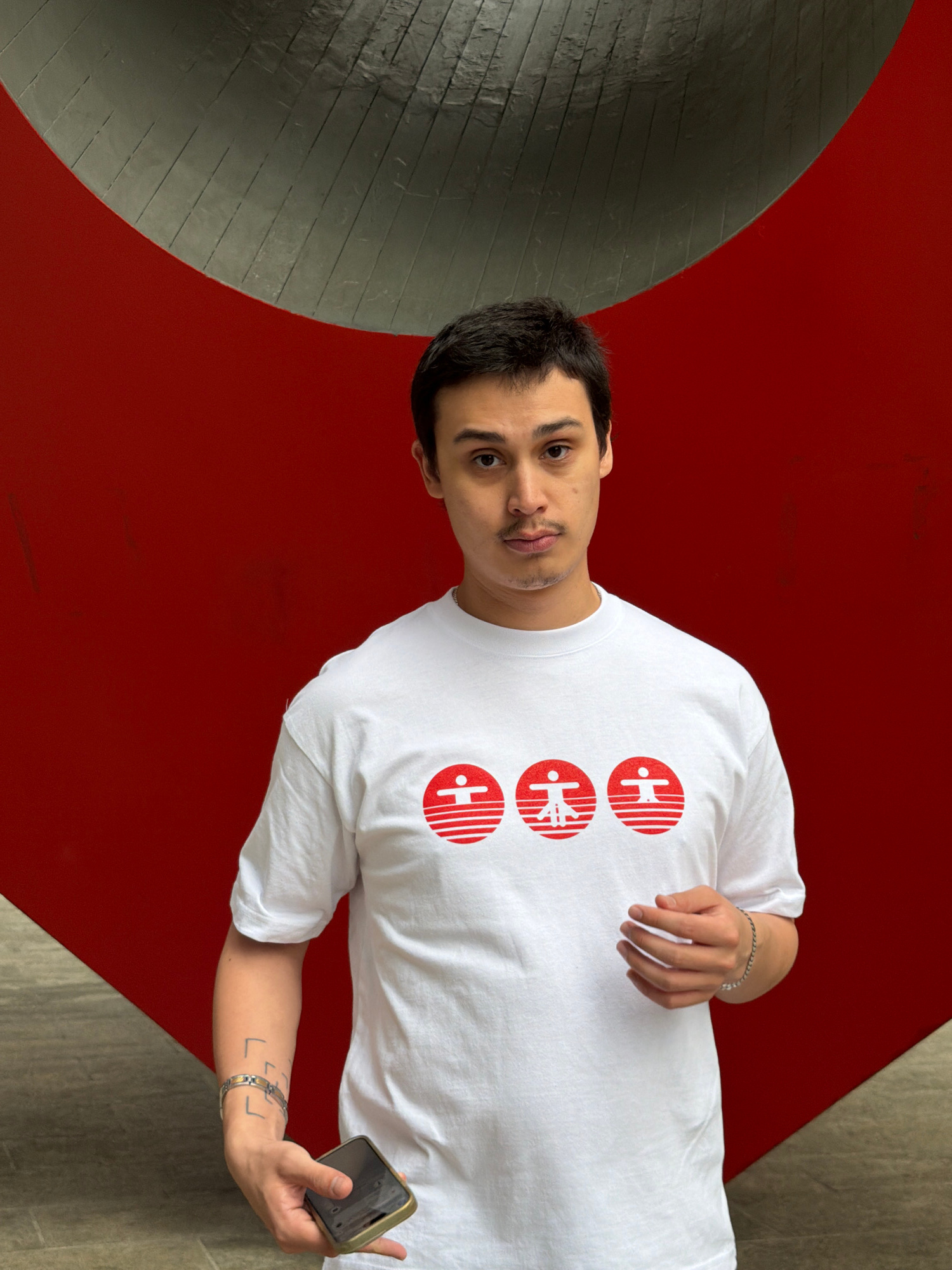A man stands in front of a large sculpture or architectural detail that is painted in two colors, gray and red. The man is wearing a white t-shirt with three red circles printed on it. Each circle con…read more