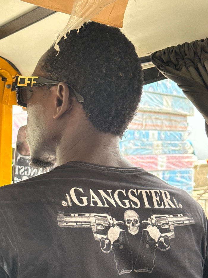 The image presents a close-up, rear-facing perspective of an individual inside a vehicle, likely a keke napep (tricycle taxi), in a bustling urban environment consistent with a market or commercial st…read more