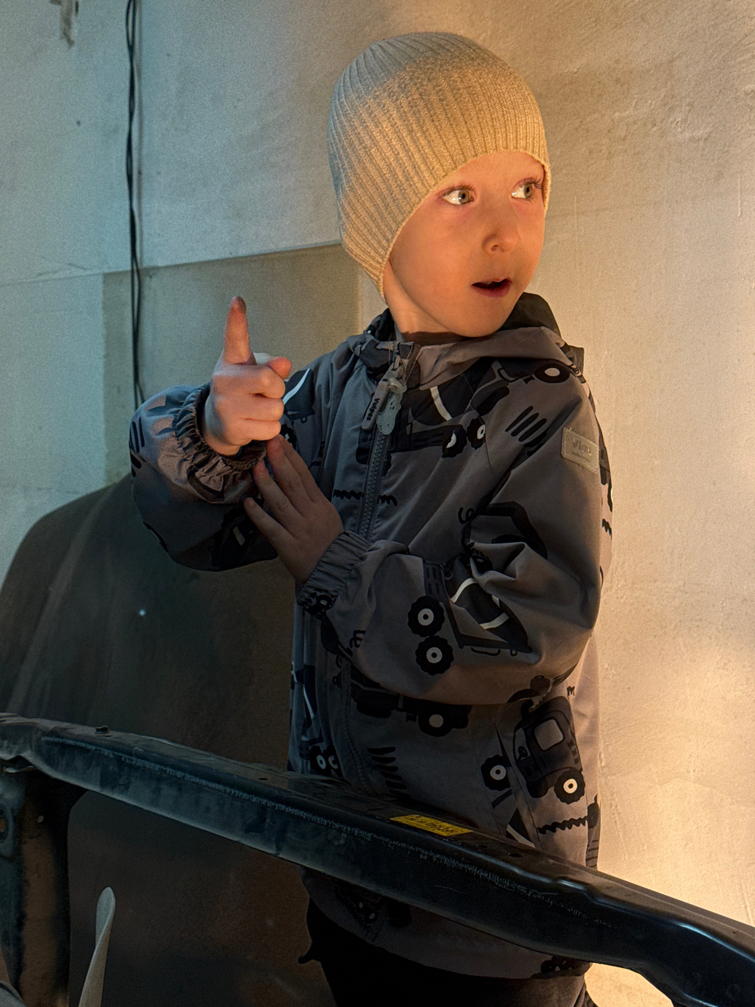 A child wearing a light tan beanie and a gray jacket with black tractor designs is pointing with their right hand. The child appears to be indoors, with a light-colored wall visible in the background.…read more