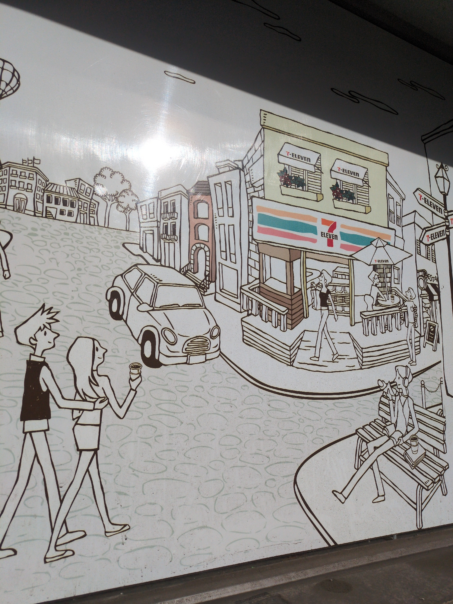 This image captures a vibrant, stylized street scene rendered in a cartoonish line-drawing style with limited color, appearing to be a mural or artwork on a reflective surface. The setting is an urban…read more