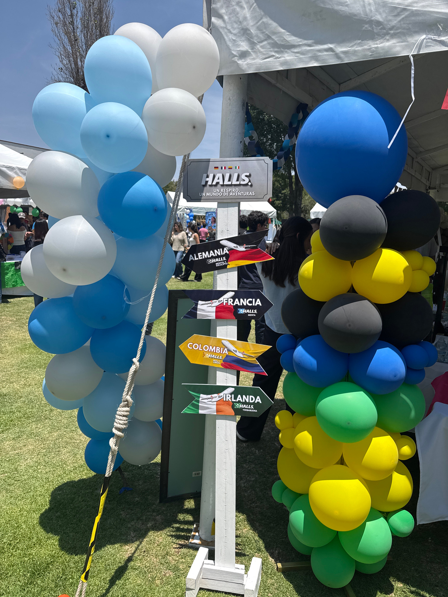 This media file captures an outdoor event in San Andrés Cholula, Mexico, on a bright and sunny day. The scene is dominated by vibrant balloon decorations and promotional displays. Large clusters of ba…read more