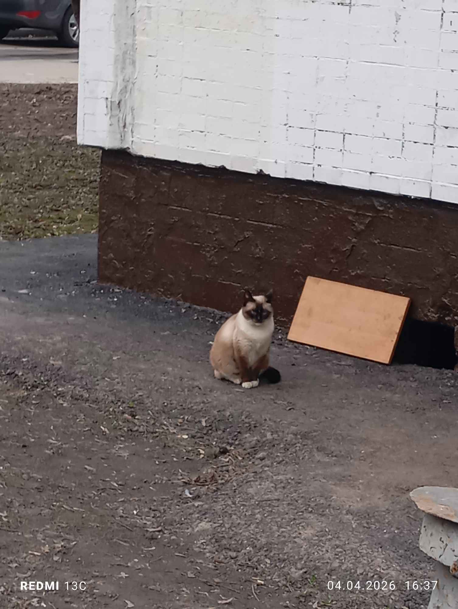 A Siamese cat sits on a gray, gravelly surface next to a building foundation. The building has a lower portion painted brown and an upper portion with whitewashed brick. A wooden plank leans against t…read more