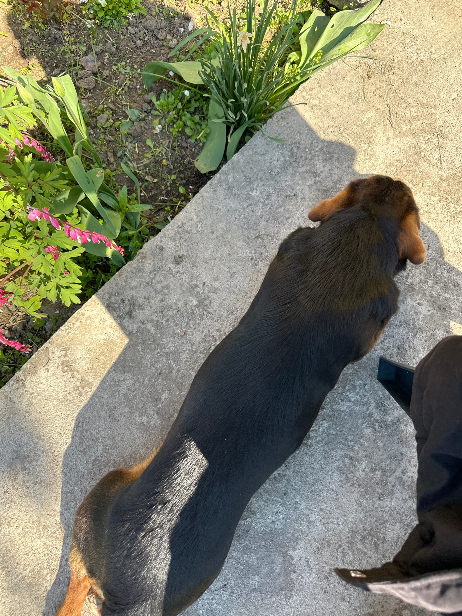 A dark, possibly black and tan dachshund-type dog is lying on a light grey concrete surface. The dog's head is dark brown and its legs are tan. The dog's head is near a patch of green plants, with pinβ¦read more