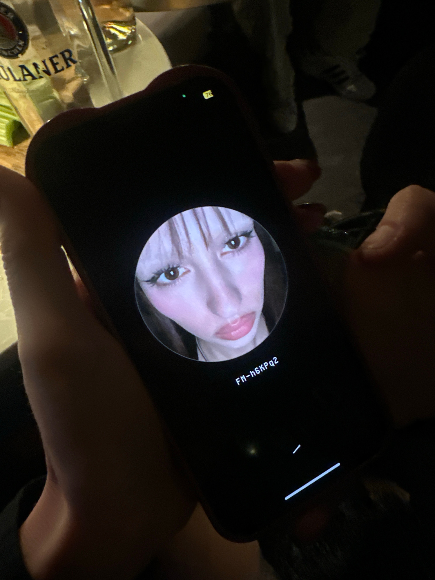 The image shows a person holding a smartphone. The phone's screen displays a close-up photo of a woman's face in a circular frame, with text "FM-h6kpq2" displayed beside it. A partial view of a beer b…read more