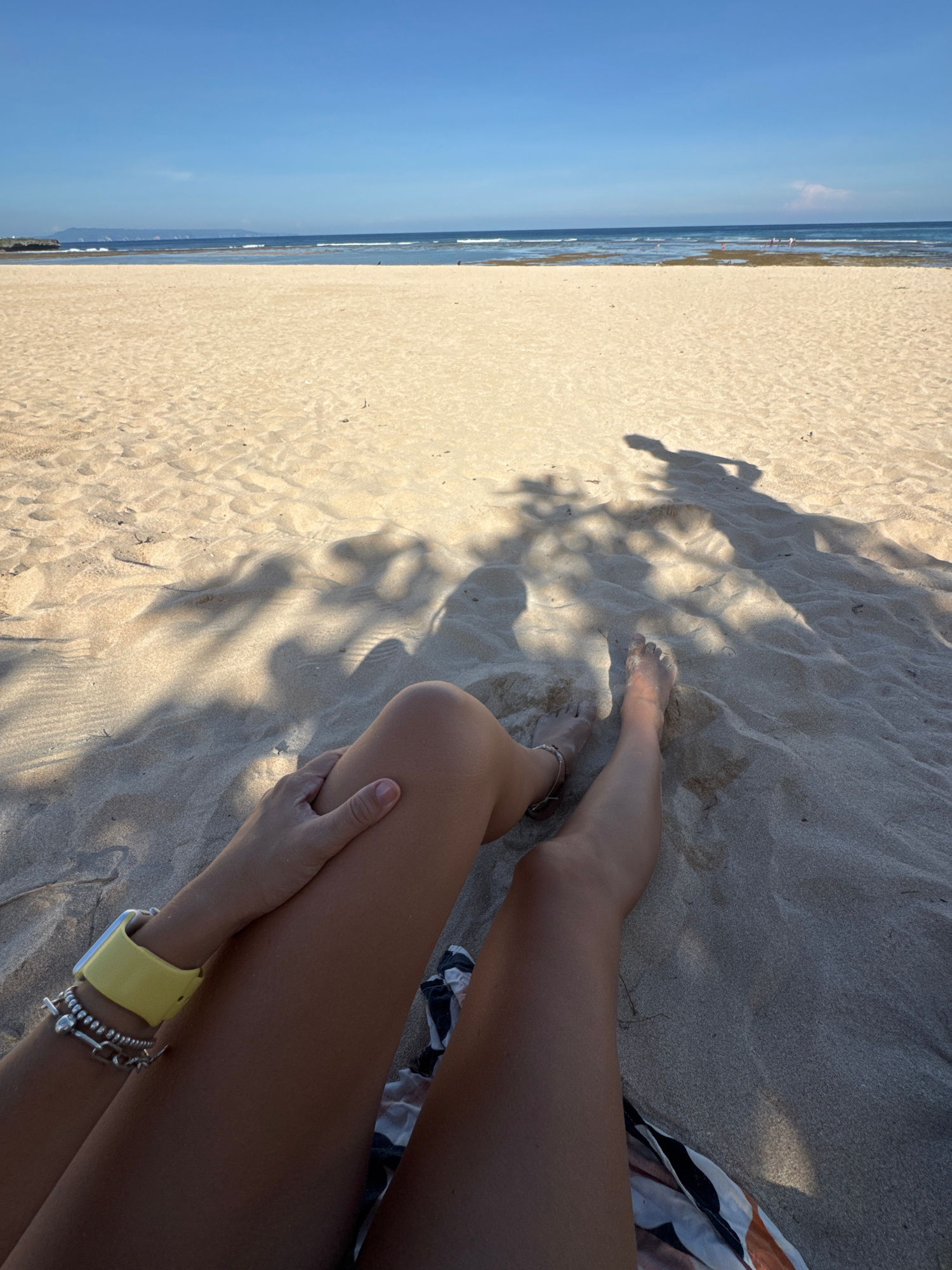 The photograph depicts a person relaxing on the sand at a beach in Kuta Selatan, Indonesia. The beach stretches along the coastline, meeting the ocean under a clear blue sky. A person is positioned in…read more