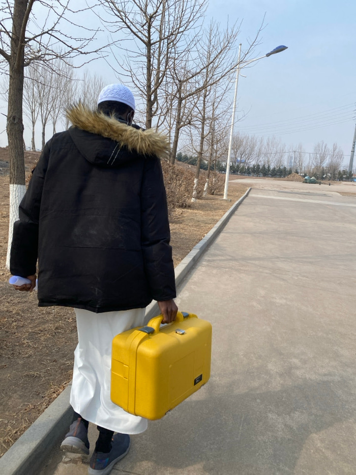 A single individual is observed from behind, walking on a paved surface in Zhongtun, China, under a clear sky. The person is wearing a white kufi cap, a black hooded winter jacket with a brown fur-tri…read more