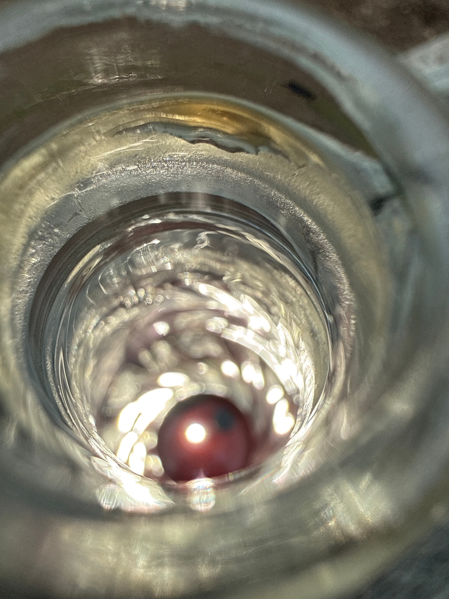 The image shows the interior of a cylindrical metal object, possibly a pipe or tube, with light reflecting off the inner surface. The material appears to be metallic with visible surface imperfections…read more