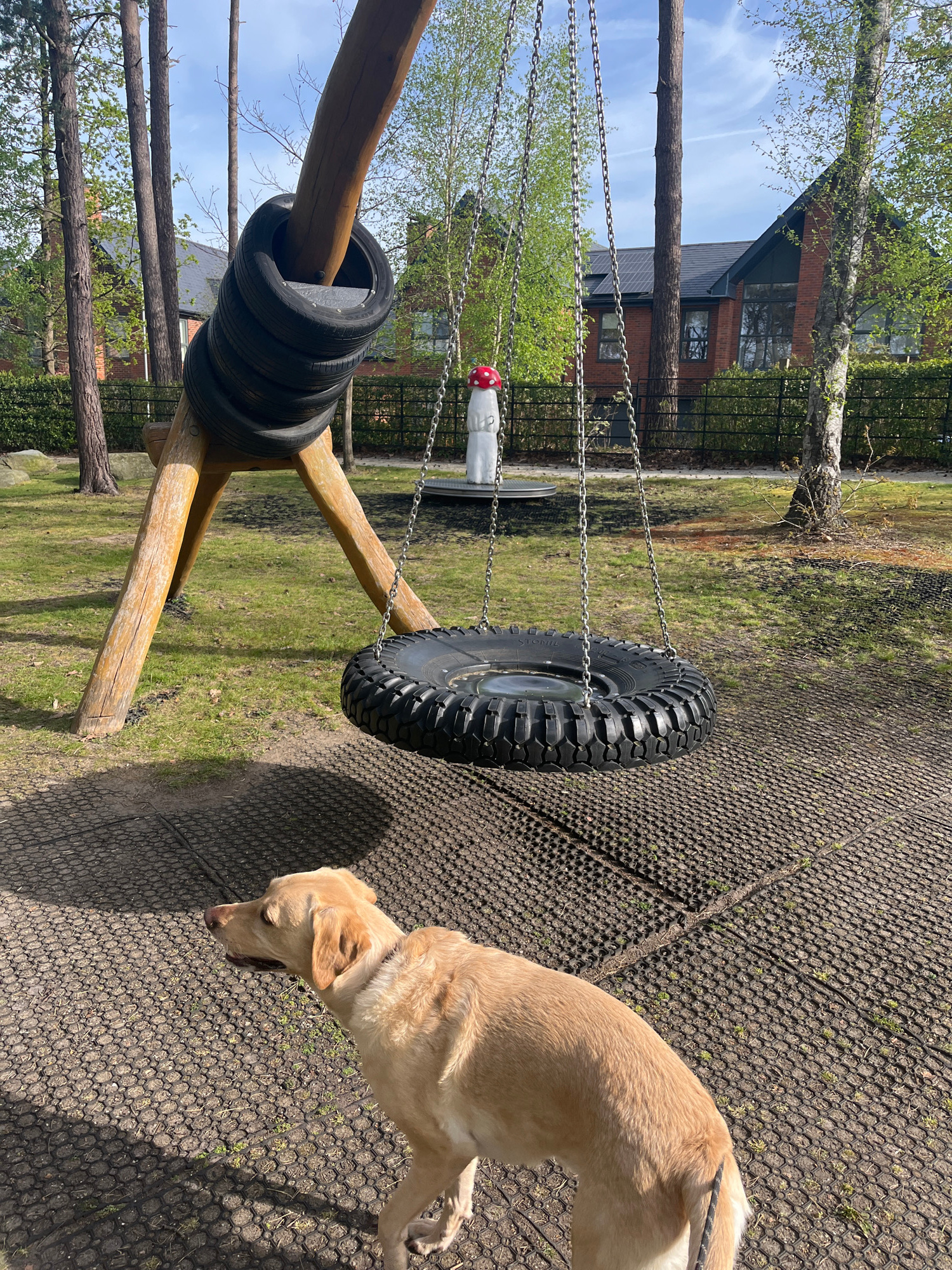 A medium-angle, exterior shot shows a playground in the Borough of Runnymede, United Kingdom. A light-brown dog, possibly a Labrador, is in the right foreground, its head bent downward. The ground has…read more