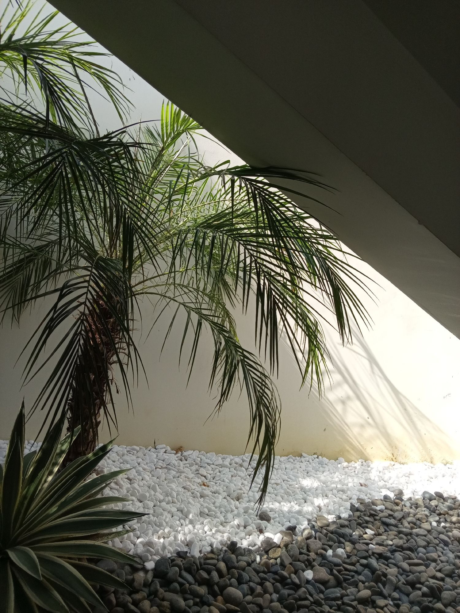 A view of a small garden at Bac Natural Heritage Area Trang, Vietnam, framed by a structural overhang. A small palm tree and a spiky plant are the main subjects, surrounded by a bed of white pebbles t…read more