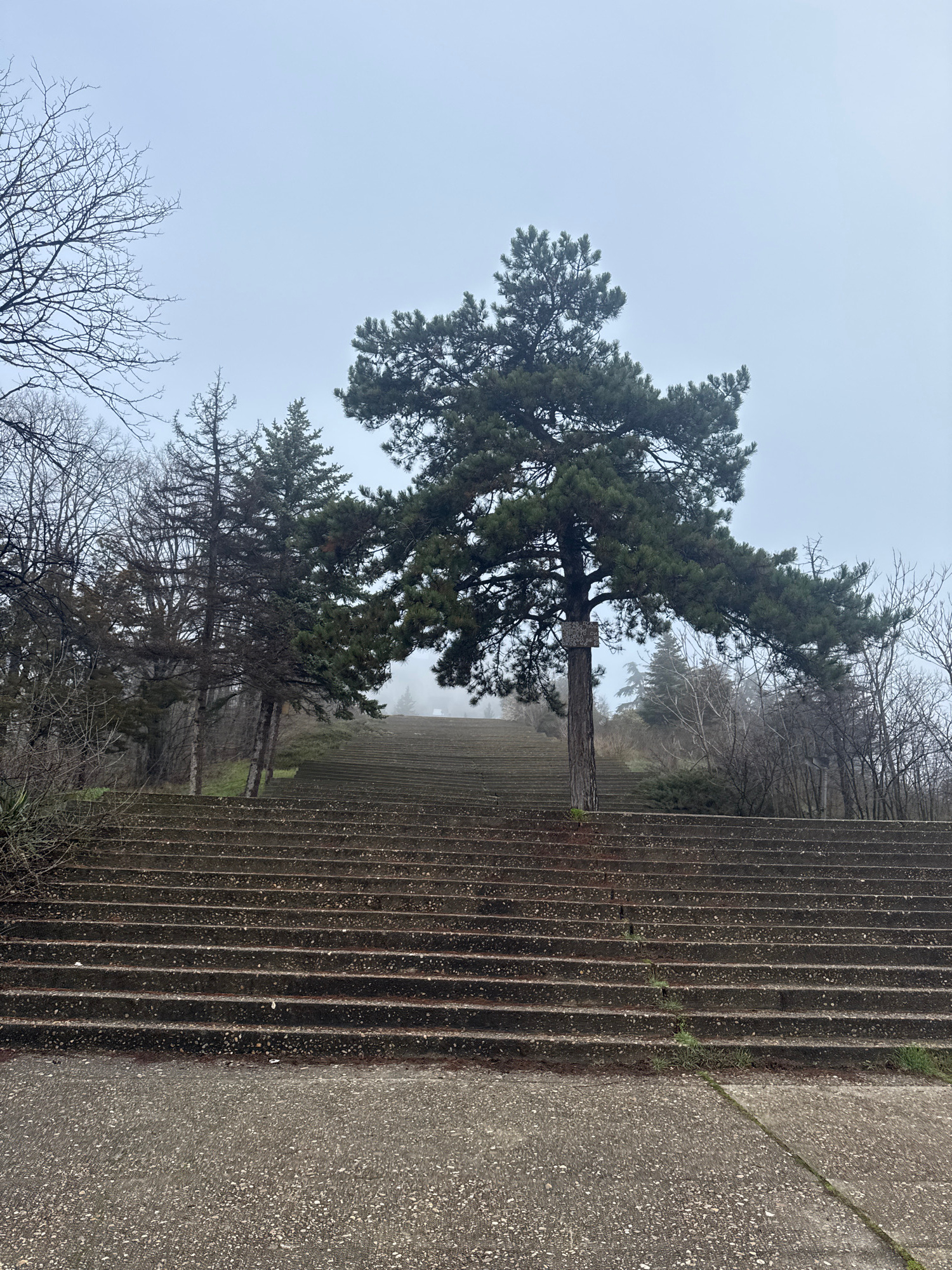 The image shows a scene from Varna, Bulgaria, featuring a set of concrete stairs leading down a hillside on a foggy day. A large pine tree stands beside the stairs, obscuring the view beyond. There ar…read more