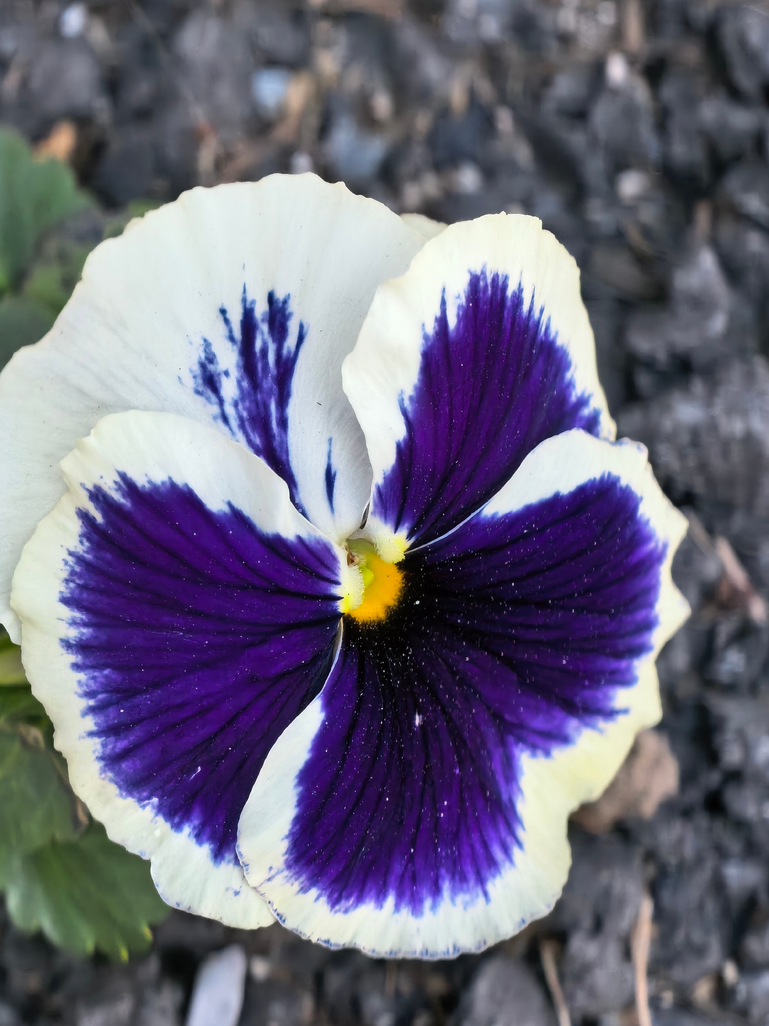 A close-up image shows a single viola flower with white and purple petals. The flower has a yellow center surrounded by black. The petals feature a dark purple section towards the center, transitionin…read more