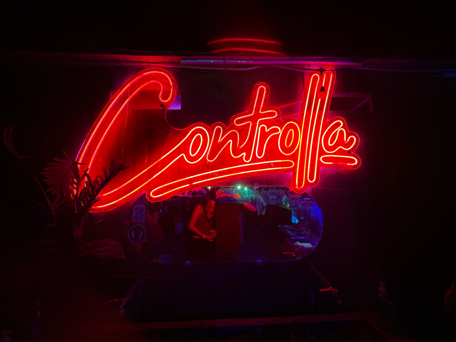 The image shows a dark, dimly lit interior in Brisas de Zicatela, Mexico. A bright red neon sign spelling "Controlla" is the focal point, positioned above what appears to be a DJ booth or performance…read more
