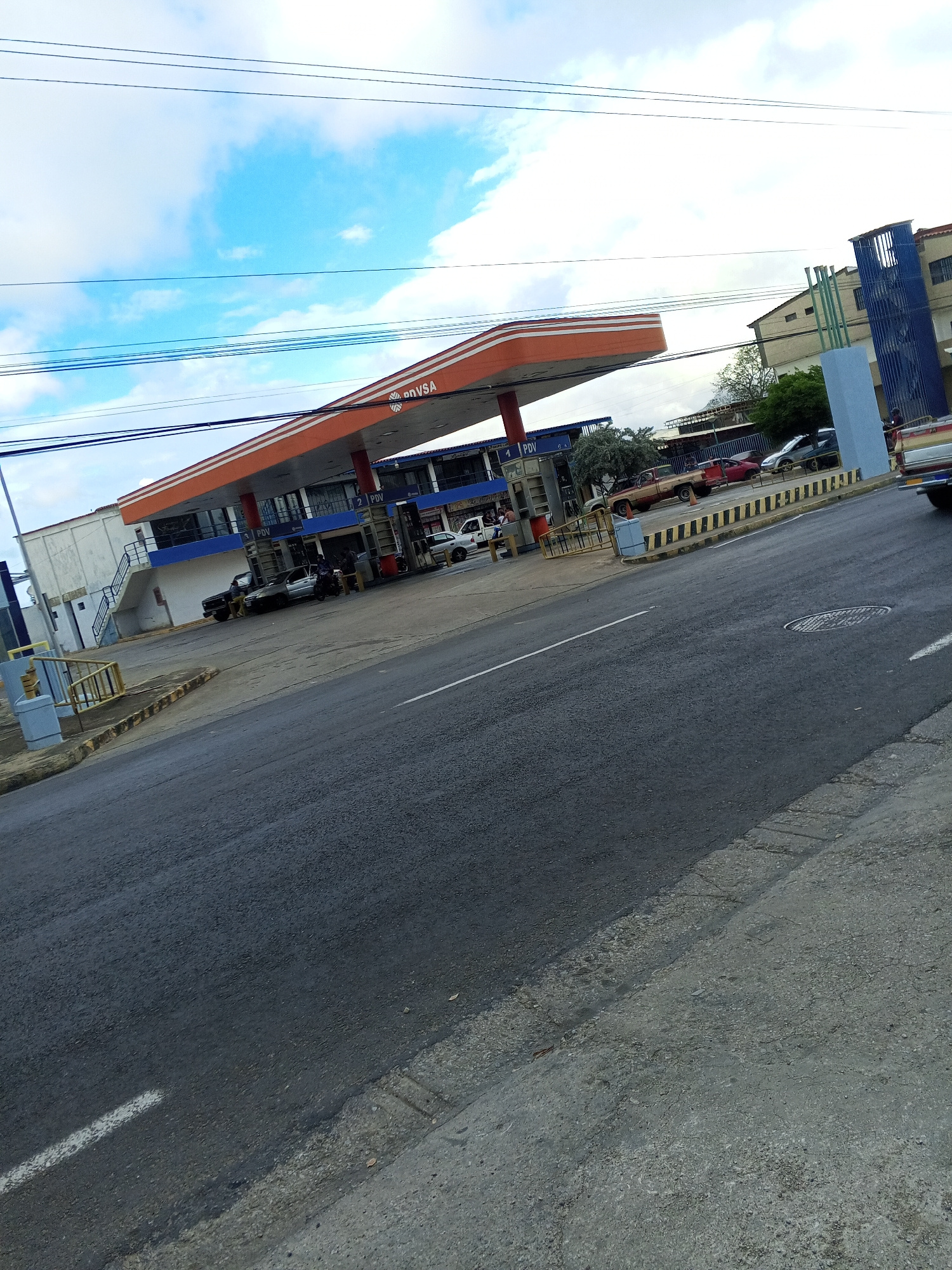 The image shows a PDVSA gas station in Juan Griego, Venezuela. The gas station has an orange roof with blue accents, with multiple vehicles parked underneath. Several people are visible around the gas…read more