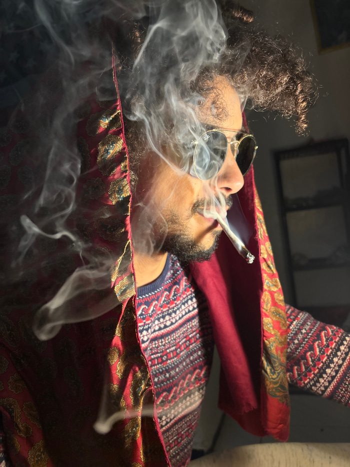 A man with dreadlocks and sunglasses reclines, exhaling smoke from a lit cigarette. He wears a dark blue sweater with a red and white pattern. A red and gold patterned blanket or shawl surrounds him.…read more