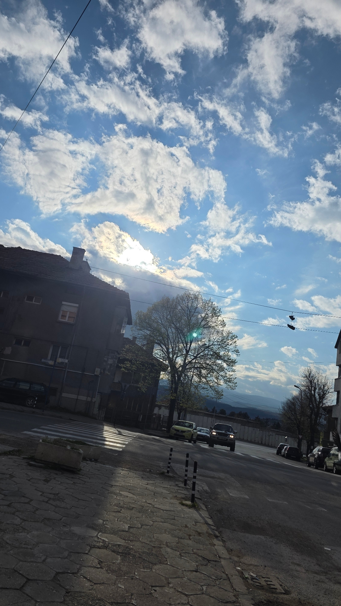 The image captures a street scene in Blagoevgrad, Bulgaria. The view is from the sidewalk, looking towards a street with several parked and moving vehicles. The street runs adjacent to a building, lik…read more
