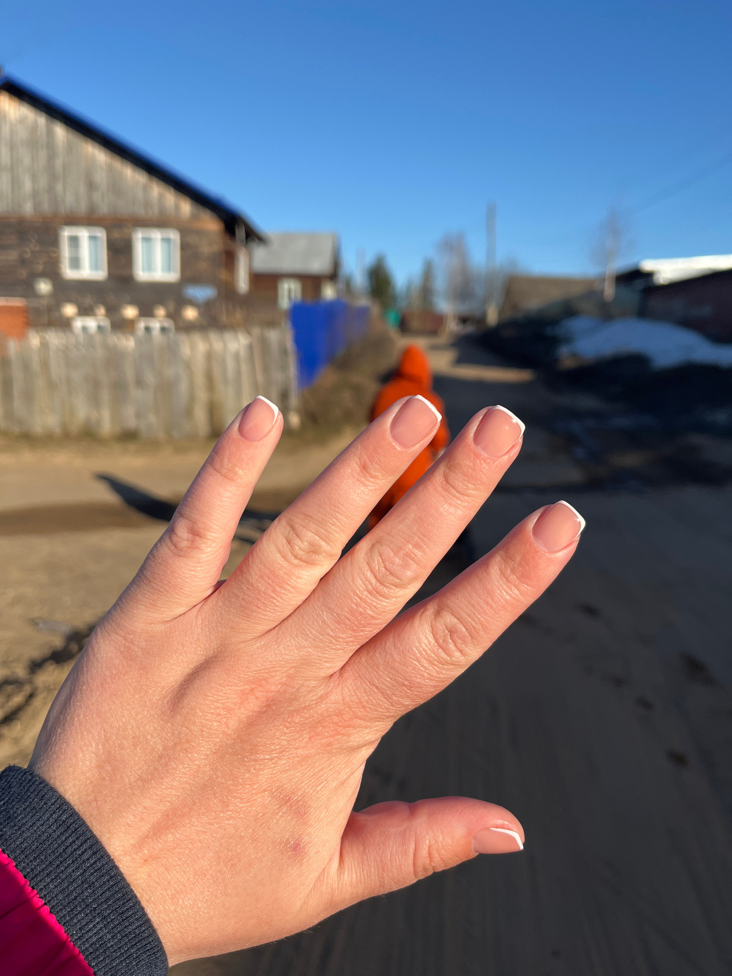 The image shows a woman's right hand with a French manicure held against an out-of-focus background. The background appears to be a rural or suburban area with weathered wooden buildings and a clear b…read more