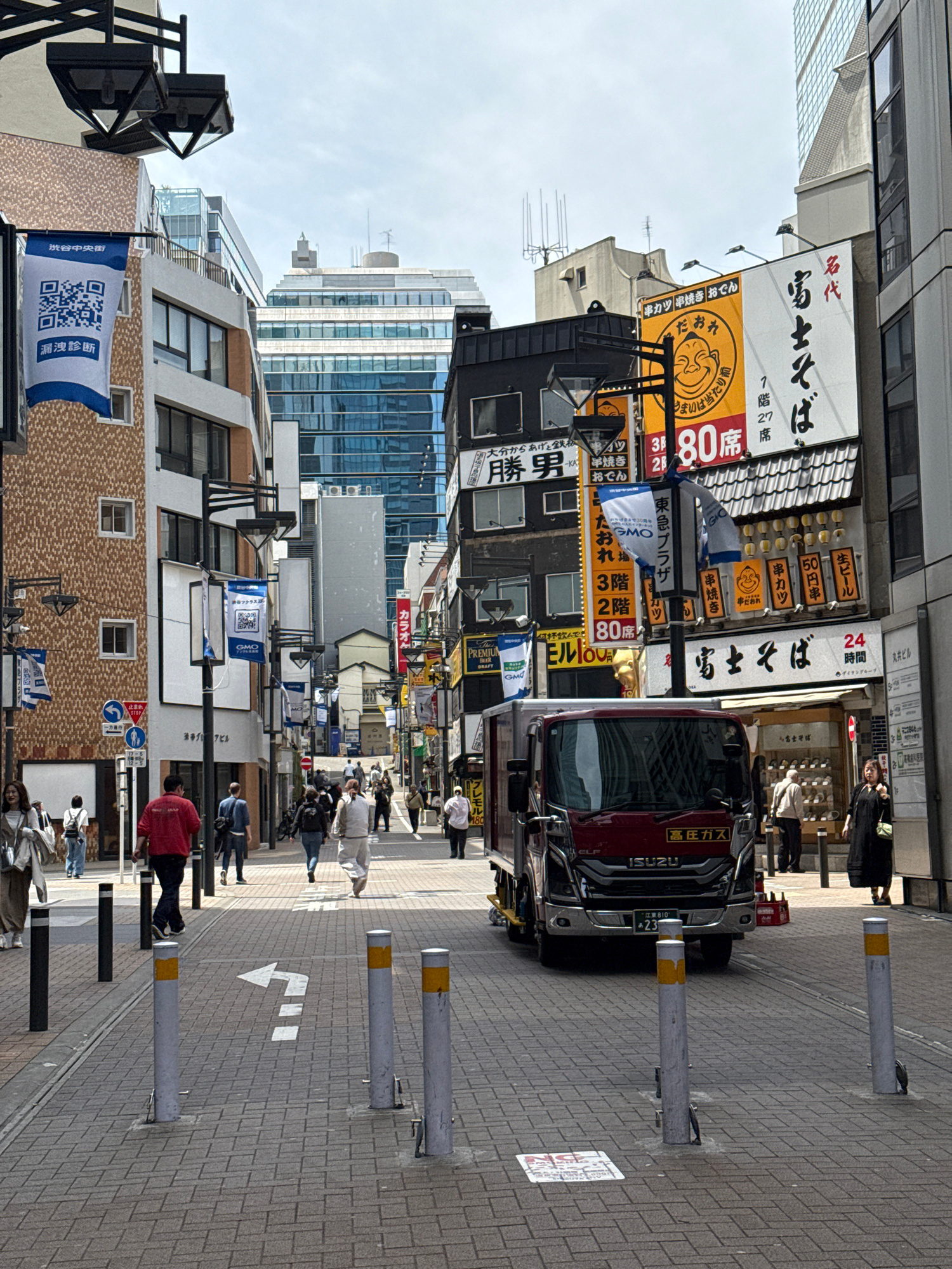 The image depicts a bustling street in Shibuya, Japan, identified by signage and flags. A maroon Isuzu truck is parked on the right side of the street, near a building with numerous illuminated signs…read more