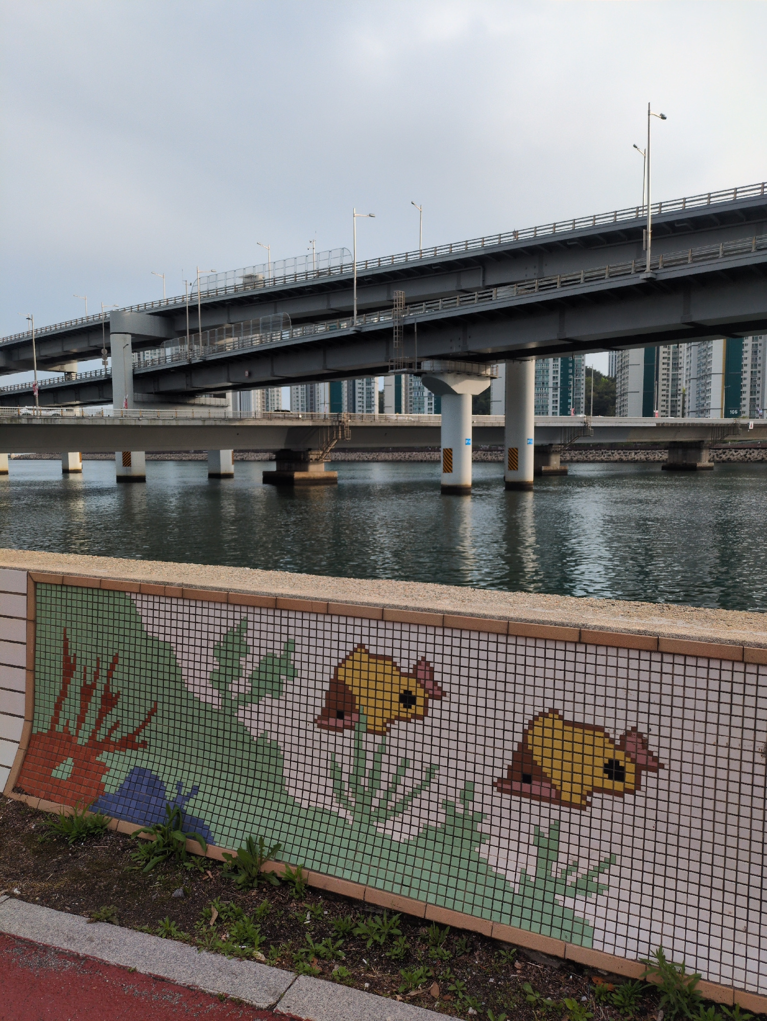 The image depicts a waterfront scene in Busan, South Korea. A multi-tiered bridge dominates the left side of the frame, with its supports visible in the water. High-rise buildings are seen in the back…read more
