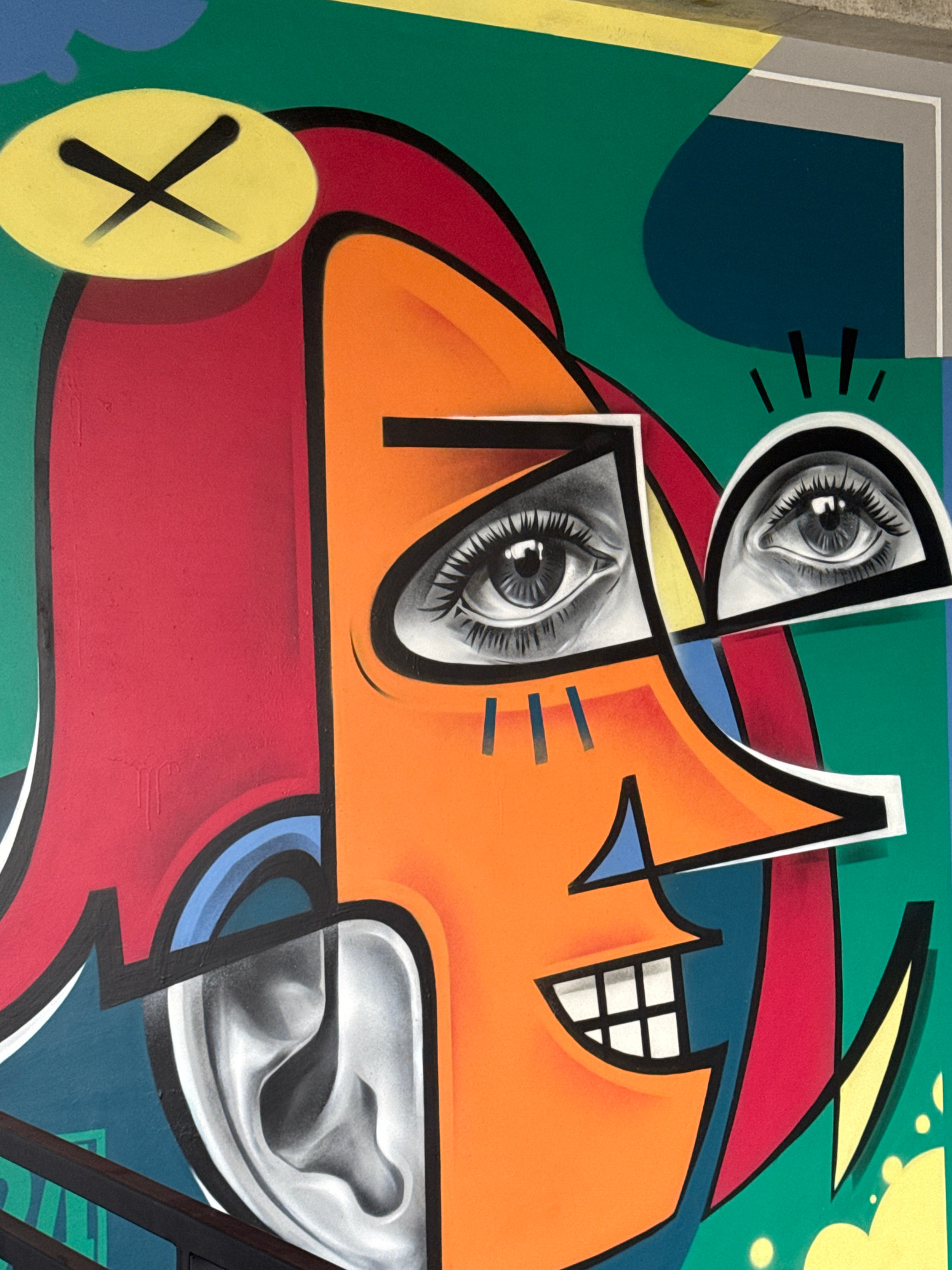 The image shows a colorful abstract mural. The artwork features exaggerated facial features, including two large, realistic eyes in stylized shapes, an orange face, teeth represented by squares, and a…read more
