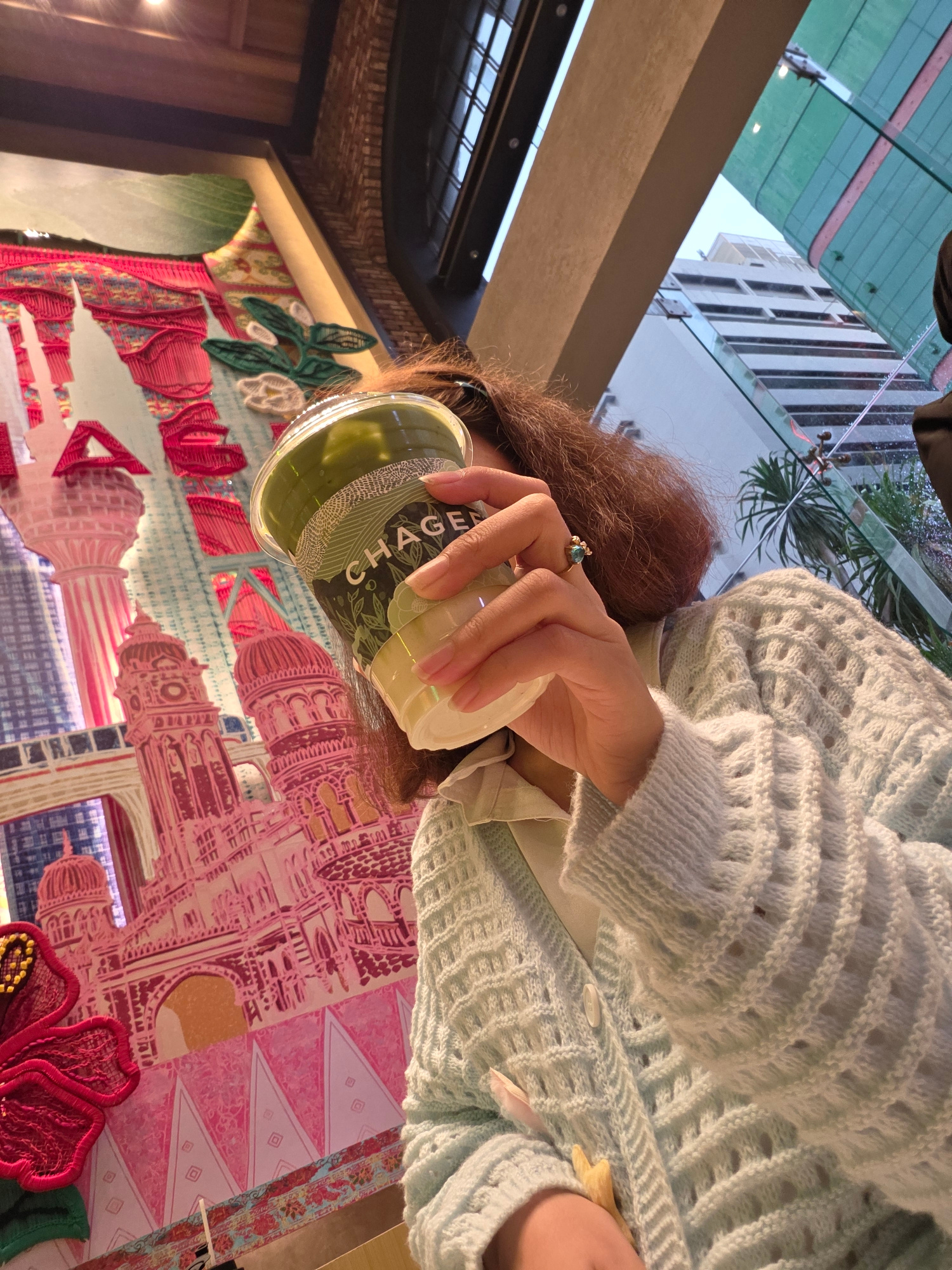 The image is a low-angle shot looking up at a person holding a "CHAGEE" drink. The person is wearing a light blue crocheted sweater and a ring is visible on their finger. Their face is partially obscu…read more