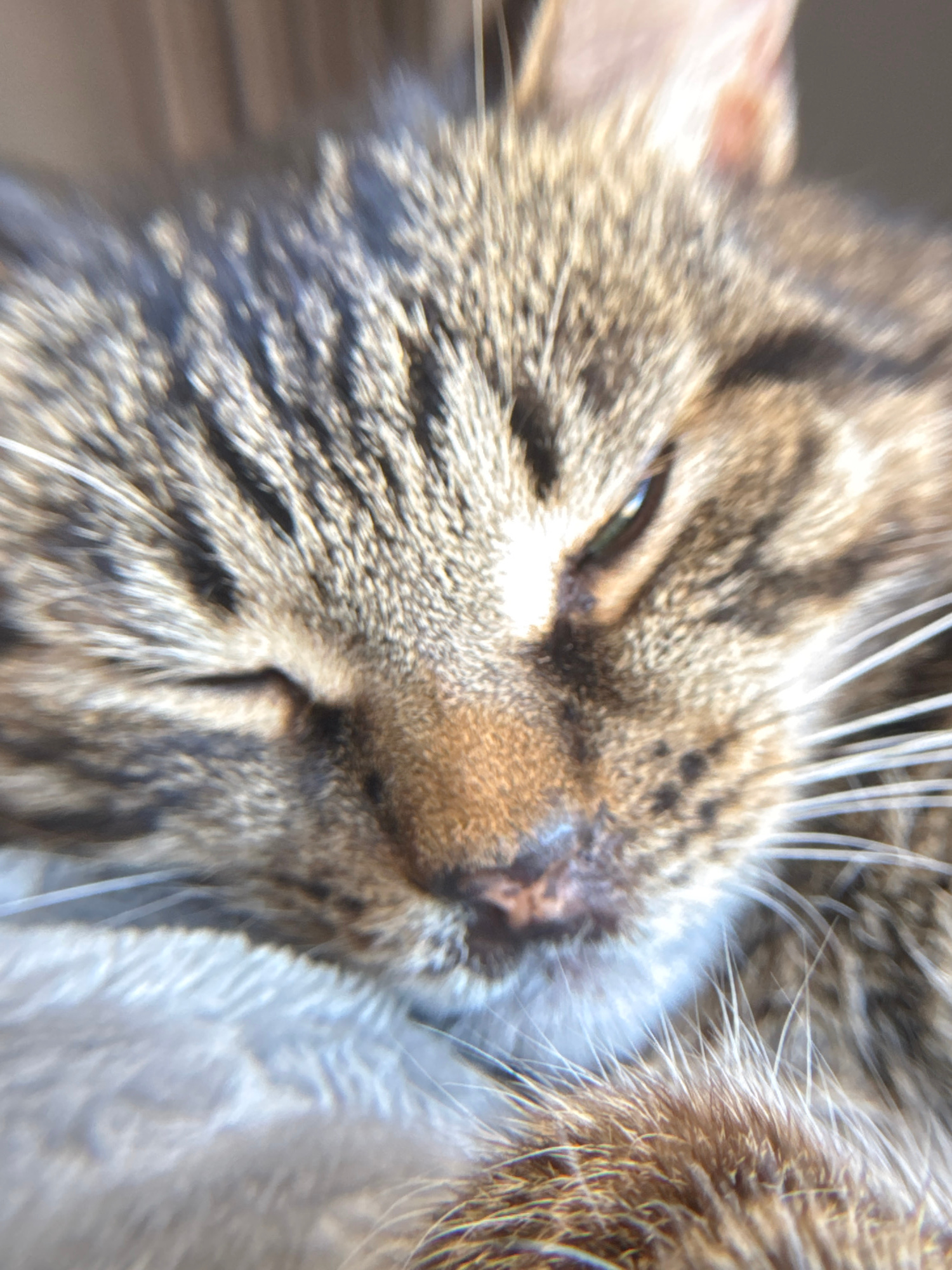 A close-up, slightly blurry photograph shows the face of a brown tabby cat. The cat's eye is partially closed. Whiskers are prominent. The cat is the main subject. The surrounding environment is out o…read more