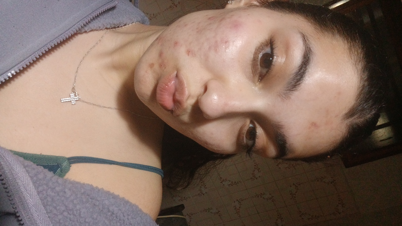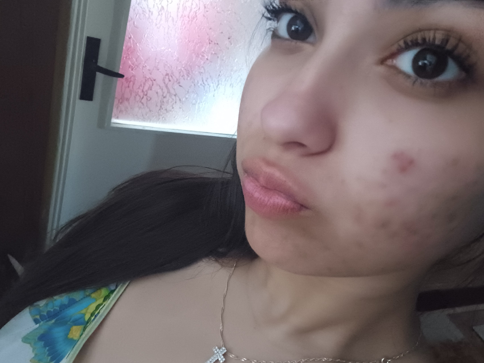 A close-up, rotated view of a person with dark hair, brown eyes, and skin with some acne scarring. The person is wearing mascara and a thin necklace with a cross pendant. The background features a doo…read more