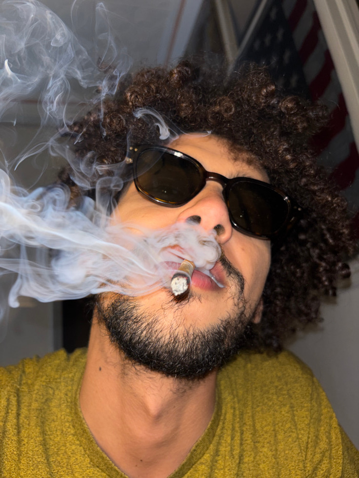 A person with curly dark hair and a beard is wearing sunglasses and smoking, exhaling a large cloud of smoke. They are wearing a yellow-green sweater and are positioned in front of what appears to be…read more