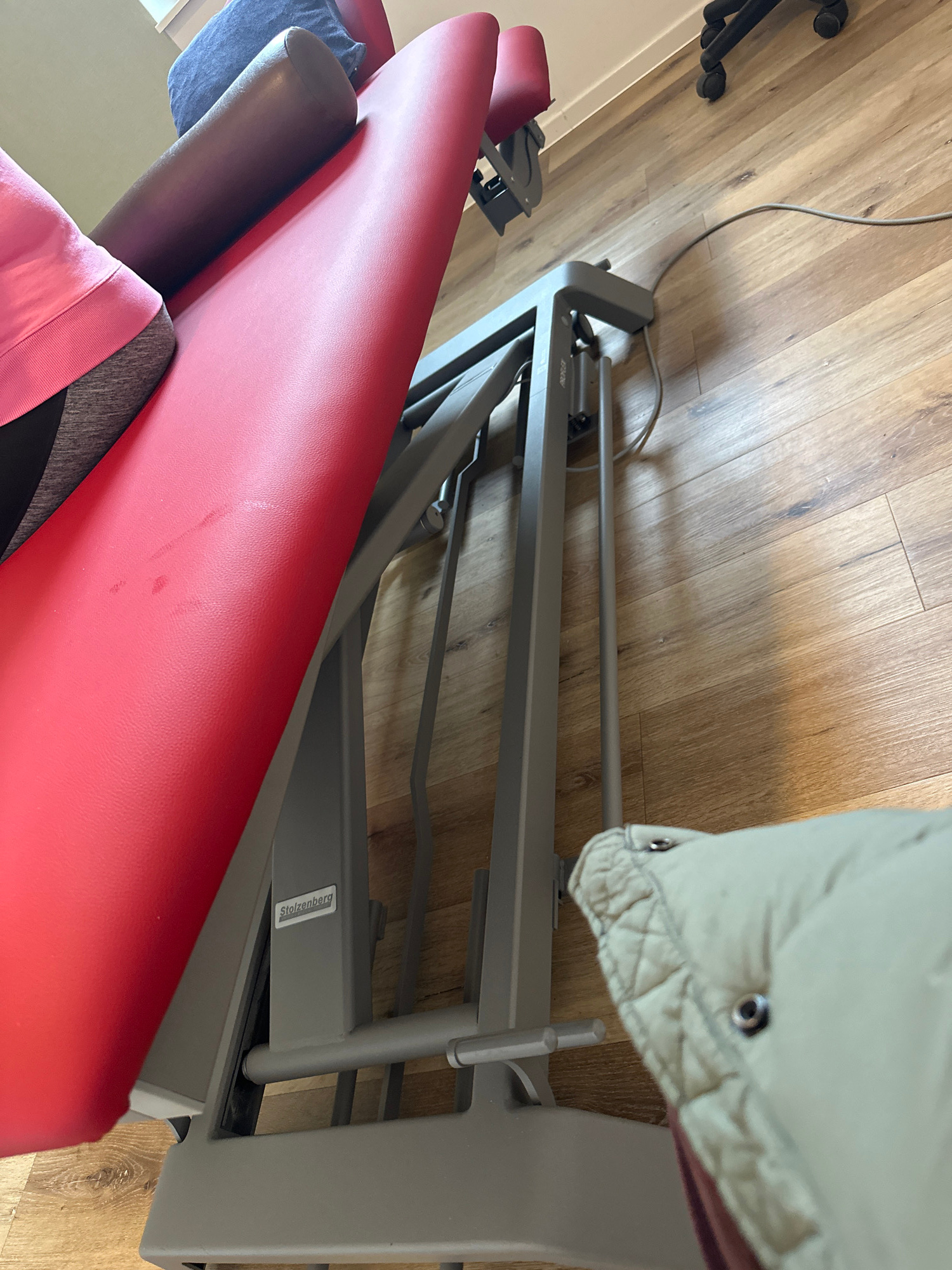 A close-up, slightly tilted shot shows a piece of fitness equipment, specifically a weight bench or similar apparatus, sitting indoors on a wooden floor. The bench features a padded red surface, with…read more