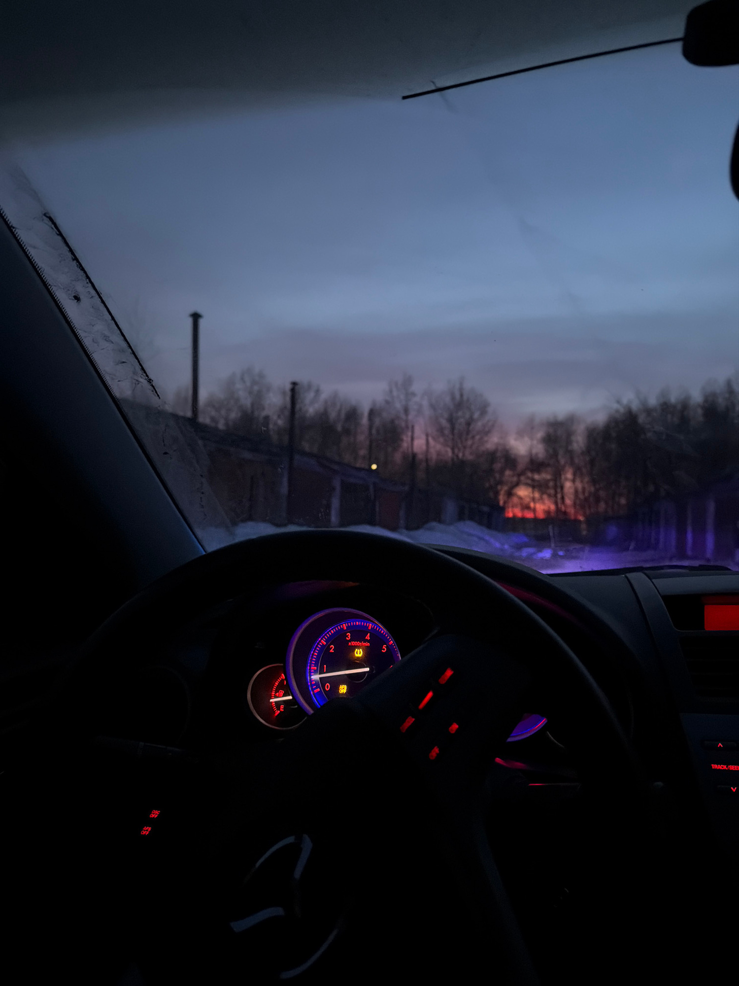 The image captures a scene from inside a vehicle, looking out through the windshield at dusk or dawn. The view is dominated by the car's interior on the right, featuring a dark steering wheel and an i…read more